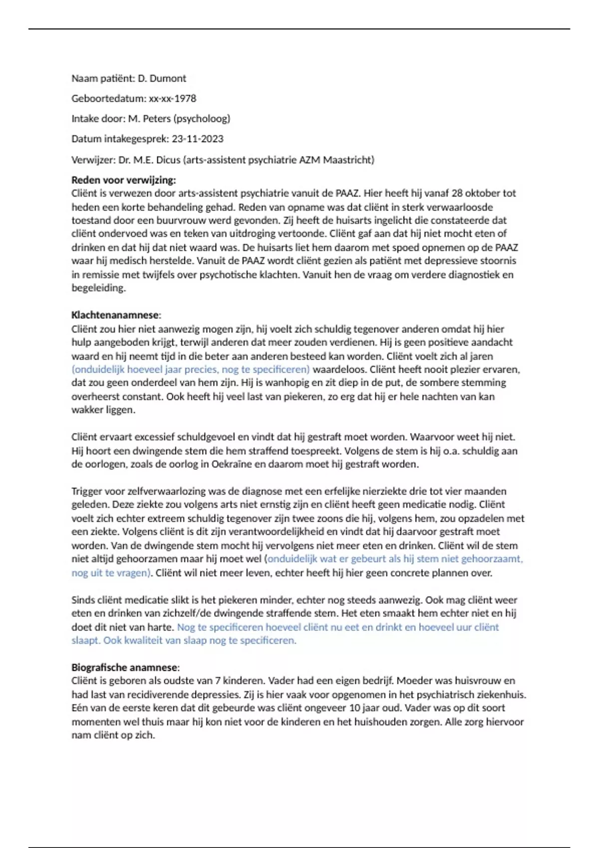 nog uit te vragen). Cliënt wil niet meer leven, echter heeft hij hier geen concrete plannen over.
