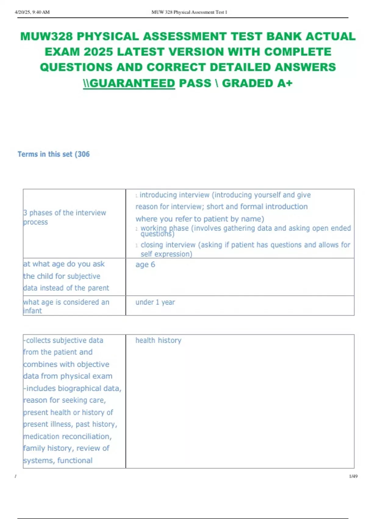 MUW328 PHYSICAL ASSESSMENT TEST BANK ACTUAL