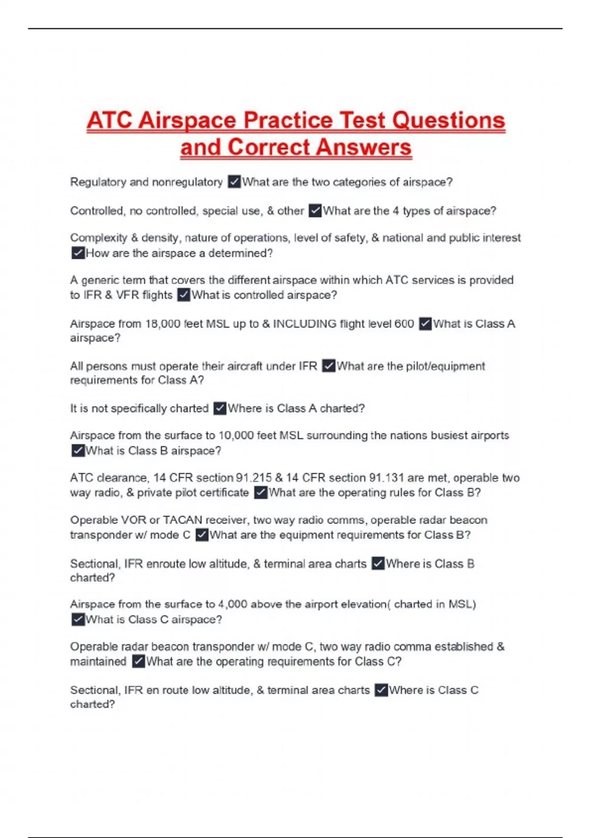 ATC Airspace Practice Test Questions and Correct Answers Regulatory and nonregulatory What are the two categories of airspace? Controlled, no controlled, special use, & other What are the 4 types of airspace? Complexity & density, nature of operations, level of safety, & national and public interest How are the airspace a determined? A generic term that covers the different airspace within which ATC services is provided to IFR & VFR flights What is controlled airspace? Airspace from 18,000 feet MSL up to & INCLUDING flight level 600 What is Class A airspace? All persons must operate their aircraft under IFR What are the pilot/equipment requirements for Class A? It is not specifically charted Where is Class A charted? Airspace from the surface to 10,000 feet MSL surrounding the nations busiest airports What is Class B airspace? ATC clearance, 14 CFR section 91.215 & 14 CFR section 91.131 are met, operable two way radio, & private pilot certificate What are the operating rules for Class B? Operable VOR or TACAN receiver, two way radio comms, operable radar beacon transponder w/ mode C What are the equipment requirements for Class B? Sectional, IFR enroute low altitude, & terminal area charts Where is Class B charted? Airspace from the surface to 4,000 above the airport elevation( charted in MSL) What is Class C airspace? Operable radar beacon transponder w/ mode C, two way radio comma established & maintained What are the operating requirements for Class C? Sectional, IFR en route low altitude, & terminal area charts Where is Class C charted?