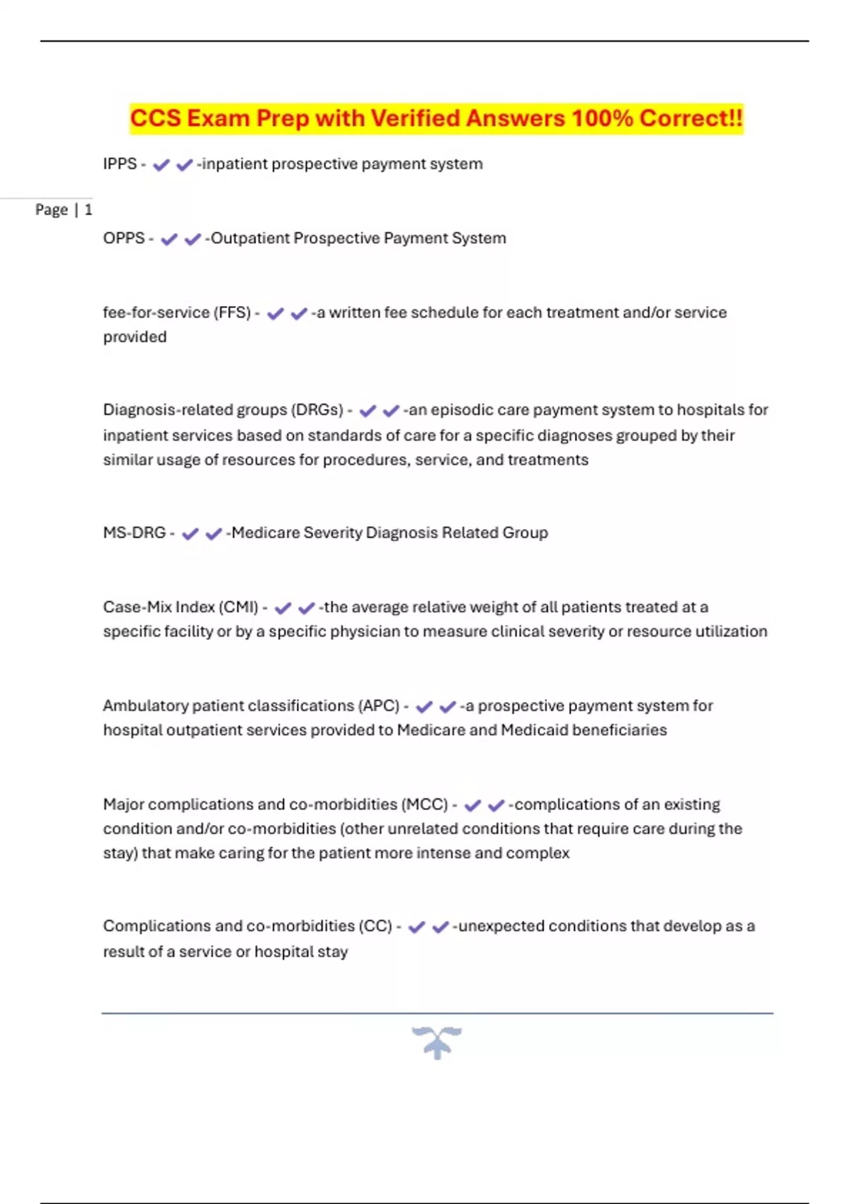 Page | 1 CCS Exam Prep with Verified Answers 100% Correct!! IPPS - -inpatient prospective payment system OPPS - -Outpatient Prospective Payment System fee-for-service (FFS) - -a written fee schedule for each treatment and/or service provided Diagnosis-related groups (DRGs) - -an episodic care payment system to hospitals for inpatient services based on standards of care for a specific diagnoses grouped by their similar usage of resources for procedures, service, and treatments MS-DRG - -Medicare Severity D