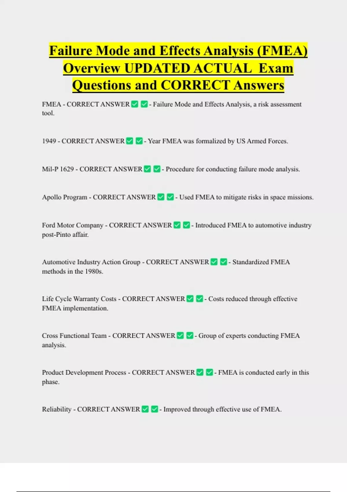 FMEA - CORRECT ANSWER - Failure Mode and Effects Analysis, a risk assessment