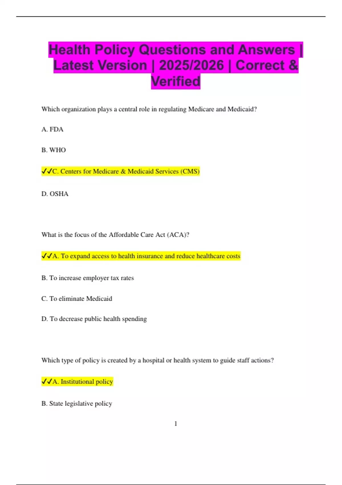 Health Policy Questions and Answers | Latest Version | 2025/2026 | Correct & Verified Which organization plays a central role in regulating Medicare and Medicaid? A. FDA B. WHO C. Centers for Medicare & Medicaid Services (CMS) D. OSHA What is the focus of the Affordable Care Act (ACA)? A. To expand access to health insurance and reduce healthcare costs B. To increase employer tax rates C. To eliminate Medicaid D. To decrease public health spending Which type of policy is created by a hospital or health system to guide staff actions? A. Institutional policy B. State legislative policy 2 C. Federal mandate D. Judicial review What is an example of a public health policy? A. Laws requiring childhood vaccinations B. Restaurant food menus C. Private insurance advertising D. Staffing ratios in private clinics Which level of government is responsible for licensing healthcare professionals? A. State B. Federal C. Local D. National What is one responsibility of a nurse in influencing health policy? A. Enforcing legal decisions B. Advocating for patient rights and access to care 3 C. Writing medical laws D. Appointing legislators Which agency oversees drug approval and public safety of medications? A. CDC B. Food and Drug Administration (FDA) C. OSHA D. CMS Why is health equity important in health policy? A. To support hospitals B. To reward private insurance C. To ensure all individuals have fair access to healthcare services D. To protect insurance companies Which act protects patient privacy in health records? A. HIPAA B. ACA