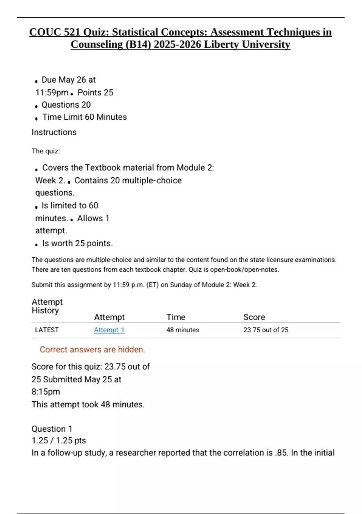 COUC 521 Quiz: Statistical Concepts: Assessment Techniques in Counseling (B14) Liberty University