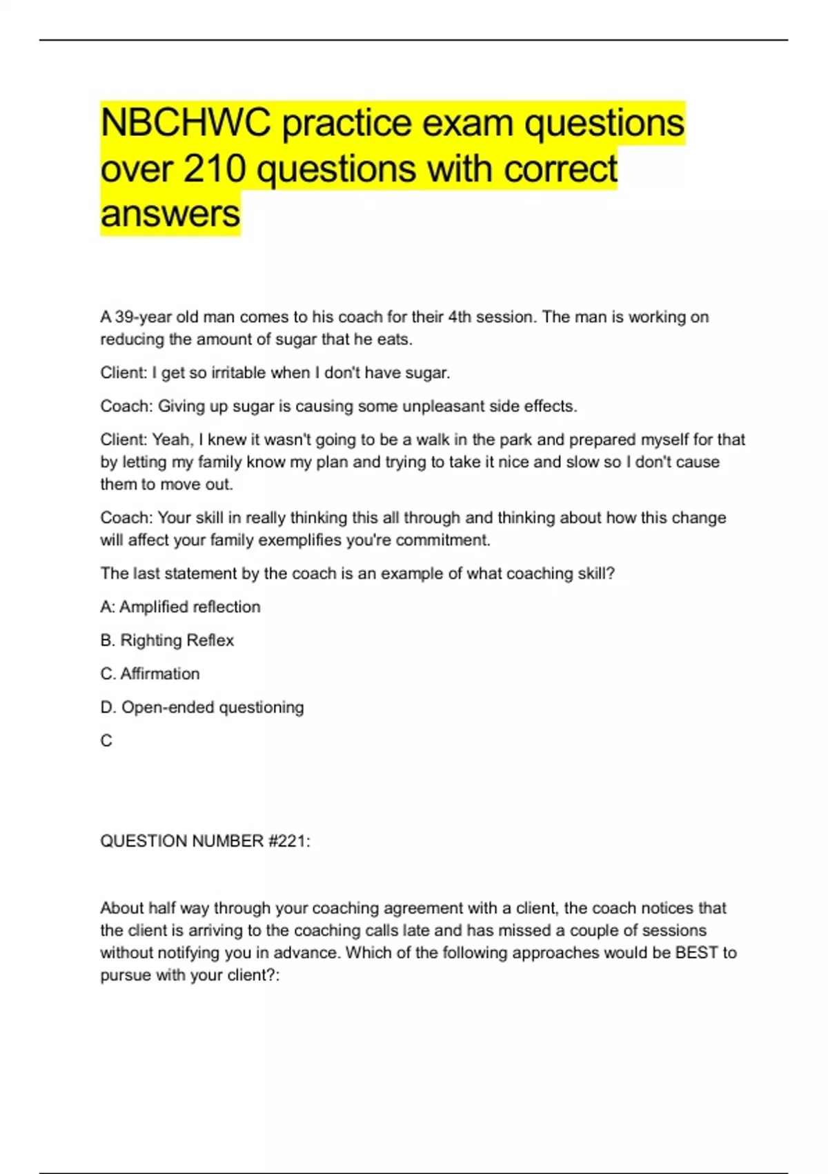NBCHWC practice exam questions over 210 questions with correct answers A 39-year old man comes to his coach for their 4th session. The man is working on reducing the amount of sugar that he eats. Client: I get so irritable when I don't have sugar. Coach: Giving up sugar is causing some unpleasant side effects. Client: Yeah, I knew it wasn't going to be a walk in the park and prepared myself for that by letting my family know my plan and trying to take it nice and slow so I don't cause them to move out. Coach: Your skill in really thinking this all through and thinking about how this change will affect your family exemplifies you're commitment. The last statement by the coach is an example of what coaching skill? A: Amplified reflection B. Righting Reflex C. Affirmation D. Open-ended questioning C QUESTION NUMBER #221: About half way through your coaching agreement with a client, the coach notices that the client is arriving to the coaching calls late and has missed a couple of sessions without notifying you in advance. Which of the following approaches would be BEST to pursue with your client?: a. Explore what's working, revisit client's strengths, and create a plan for improvement b. Explore why coaching isn't working and get feedback on what specific things they don't like c. Share your observations, express empathy, and inquire as to what could make their vision and goals more of a priority d. Confront client, assess readiness for change, and discuss whether coaching is appropriate at this time C QUESTION NUMBER #223: A client comes to their 5th coaching session and has made progress in improving their sleep but is having trouble with their goal of increasing their physical activity. Client: "I really want to feel better...but it's just too hard. I've got two jobs and I take care of my parents too." Which of the following coach responses is NOT a response that would increase change talk? a. "What makes the protocol feel hard and impossible?" b. "What changes have you made in your life that felt frustrating and impossible and yet you achieved them?" c. "Let's pretend that making this change is possible and that it's not hard. What might work?" d. "What small step might be possible and not feel as hard?" A QUESTION NUMBER #224: Which of the following is recommended by MyPlate as part of a healthy diet: A. Total carbohydrate consumption should be less than 20g per day B. Total fat consumption should be less than 20% of daily caloric intake C. Eat a vegetarian diet 80% of the time D. Limiting trans and saturated fats D QUESTION NUMBER #226: An 18-year old woman comes to her fifth coaching session to discuss her continued efforts to lose weight and get healthy. After the session, the coach receives an email from the woman's parents indicating they are paying for the sessions and would like to discuss their daughter's progress so far. What is the best response from the coach? A. I would be happy to set up some time. Please email me back potential times that will work for you. Also, your daughter must be present at this meeting. B. I am not able to discuss anything about my coaching services or any clients without prior written consent from the client. C. I will ask your daughter to give me permission and get back to you. D. I would be happy to set up some time what works for you? B QUESTION NUMBER #225: A 42-year old man comes to his 5th coaching session eagerly working toward his goal of improving his relationship with his boss. Client: I tried to reason with her three times this week but my boss just didn't get it. She doesn't live in a world with reason and logic. She twice called me out in front of the group and on Friday told me I needed to step up my game AFTER I reached a major sales goal. Coach: A lot happened this week that seems frustrating. What is one thing that happened during the week between you and your boss that was an improvement from last month? The coach is demonstrating the use of what coaching technique? A. Empathy B. Amplified Reflection C. Use of Positive Psychology D. Righting Reflex C QUESTION NUMBER #222: A 55-year old woman comes to her first coaching session having completed several wellness assessments. The coach asked the client to work on these assessments at the end of their first session for what purpose? A. An assessments help the client see what parts of the wellness wheel she needs to focus on improving B. Assessments help the coach figure out where to begin with this client C.Assessments are a tool coaches use with all clients as part of their scope of practice D. Assessments help the client reflect on her life and discover aspects of her wellbeing E. The coach can refer to these assessments later in their relationship to help move the client forward with her goals D