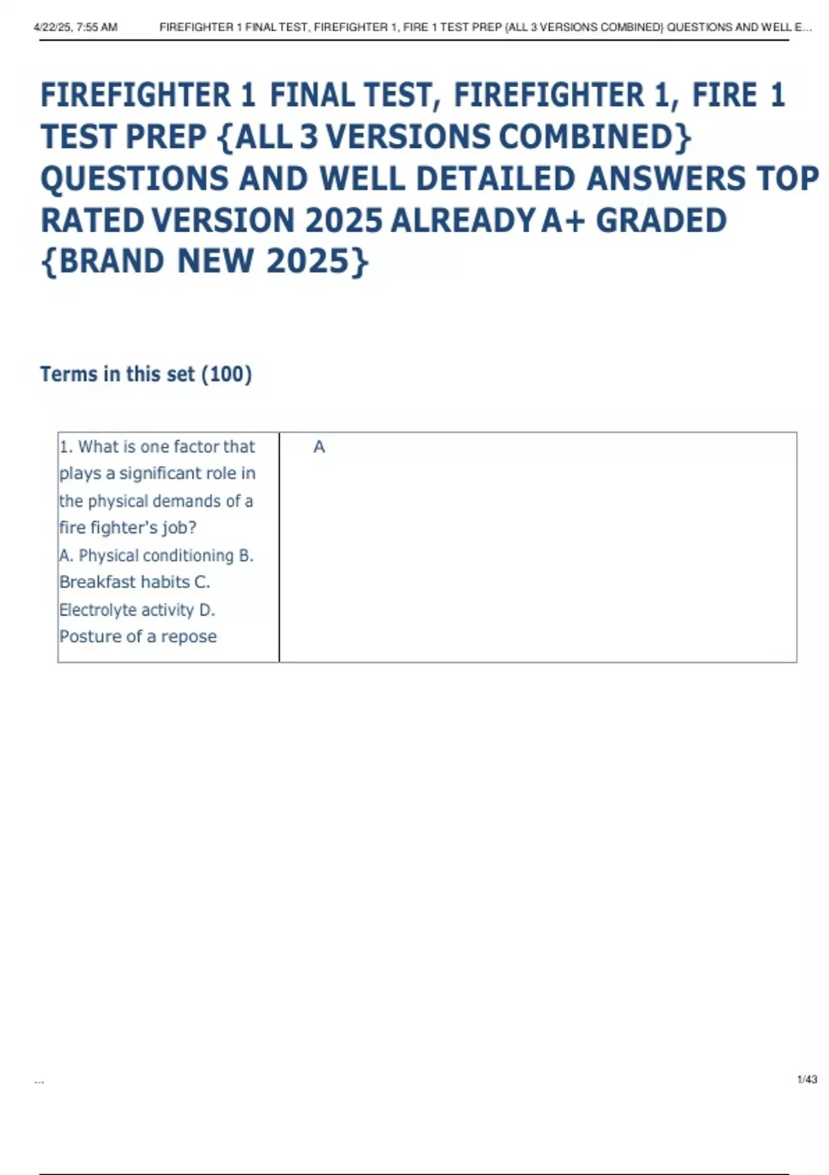 , 4/22/25, 7:55 AM FIREFIGHTER 1 FINAL TEST, FIREFIGHTER 1, FIRE 1 TEST PREP {ALL 3 VERSIONS COMBINED} QUESTIONS AND WELL E…