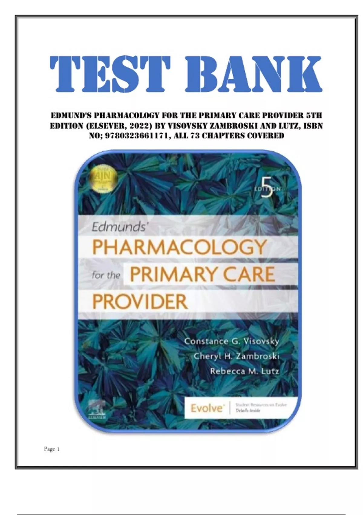 Test Bank for Edmund's Pharmacology for the Primary Care Provider 5th Edition (Elsever, 2022) by Visovsky Zambroski and Lutz, Isbn no; 9780323661171, all 73 Chapters Covered
