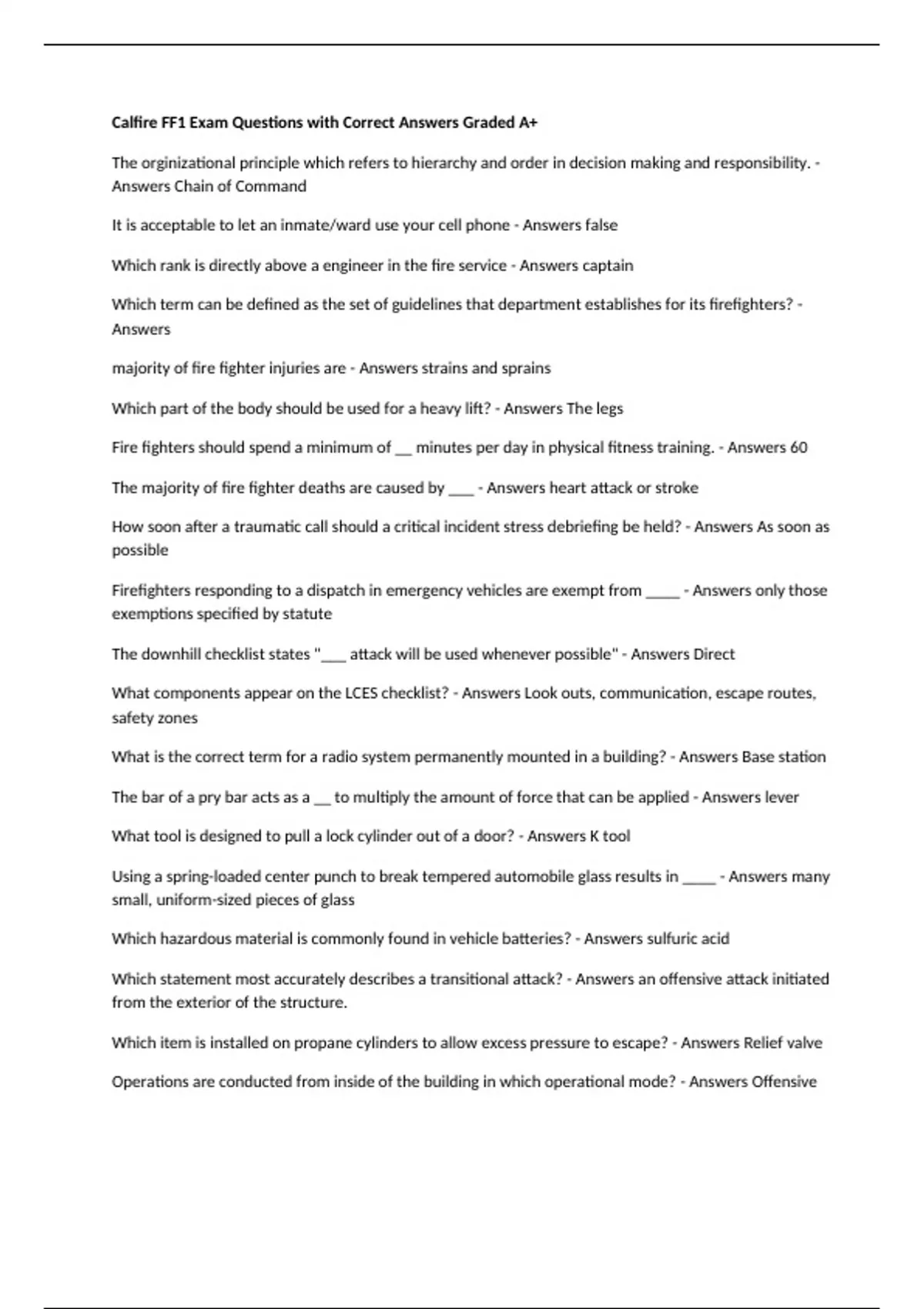 Calfire FF1 Exam Questions with Correct Answers Graded A+ The orginizational principle which refers to hierarchy and order in decision making and responsibility. - Answers Chain of Command It is acceptable to let an inmate/ward use your cell phone - Answers false Which rank is directly above a engineer in the fire service - Answers captain Which term can be defined as the set of guidelines that department establishes for its firefighters? - Answers majority of fire fighter injuries are - Answers strains and sprains Which part of the body should be used for a heavy lift? - Answers The legs Fire fighters should spend a minimum of __ minutes per day in physical fitness training. - Answers 60 The majority of fire fighter deaths are caused by ___ - Answers heart attack or stroke How soon after a traumatic call should a critical incident stress debriefing be held? - Answers As soon as possible Firefighters responding to a dispatch in emergency vehicles are exempt from ____ - Answers only those exemptions specified by statute The downhill checklist states "___ attack will be used whenever possible" - Answers Direct What components appear on the LCES checklist? - Answers Look outs, communication, escape routes, safety zones What is the correct term for a radio system permanently mounted in a building? - Answers Base station The bar of a pry bar acts as a __ to multiply the amount of force that can be applied - Answers lever What tool is designed to pull a lock cylinder out of a door? - Answers K tool Using a spring-loaded center punch to break tempered automobile glass results in ____ - Answers many small, uniform-sized pieces of glass Which hazardous material is commonly found in vehicle batteries? - Answers sulfuric acid Which statement most accurately describes a transitional attack? - Answers an offensive attack initiated from the exterior of the structure. Which item is installed on propane cylinders to allow excess pressure to escape? - Answers Relief valve Operations are conducted from inside of the building in which operational mode? - Answers Offensive A master stream device that is permanently mounted on an engine and plumbed directly into the pump is a ___ - Answers Deck gun What is the target of the hose stream in a direct attack? - Answers The base of the fire Portable monitors, deck guns - Answers Master stream devices What is the most severe hazard associated with propane products? - Answers BLEVE What does the E stand for in the acronym SLICERS - Answers Extinguish the fire In which type of operation are large handlines and master streams more often used? - Answers Defensive Peeling of bubbling paint is an indicator of: - Answers concealed fire A vehicle fueled by CNG or LPG is fully involved in fire. Which of the following should be used to fight the fire - Answers Unstaffed master stream The use of master streams on a building should be prohibited if - Answers crews are working on the inside What is the intention of an indirect fire attack? - Answers Absorb heat in the fire compartment Close-range application of water to the fire is the objective of which type of operation - Answers Offensive Which of the following is a two-dimensional fire? - Answers flammable liquid spill on an open ground What is the term for the volume within a structure between an inlet and an outlet through which heat and smokecan travel on its way from an area of higher pressure to lower pressure? - Answers Flow path What is the minimum flow from a master stream device? - Answers 350 gpm