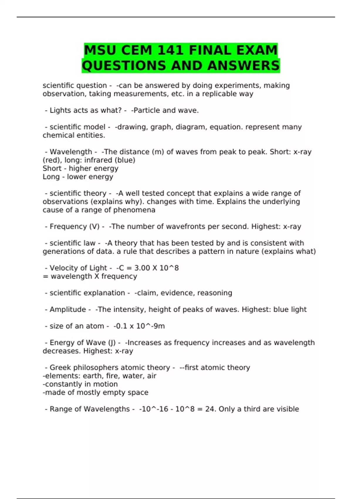 MSU CEM 141 FINAL EXAM QUESTIONS AND ANSWERS