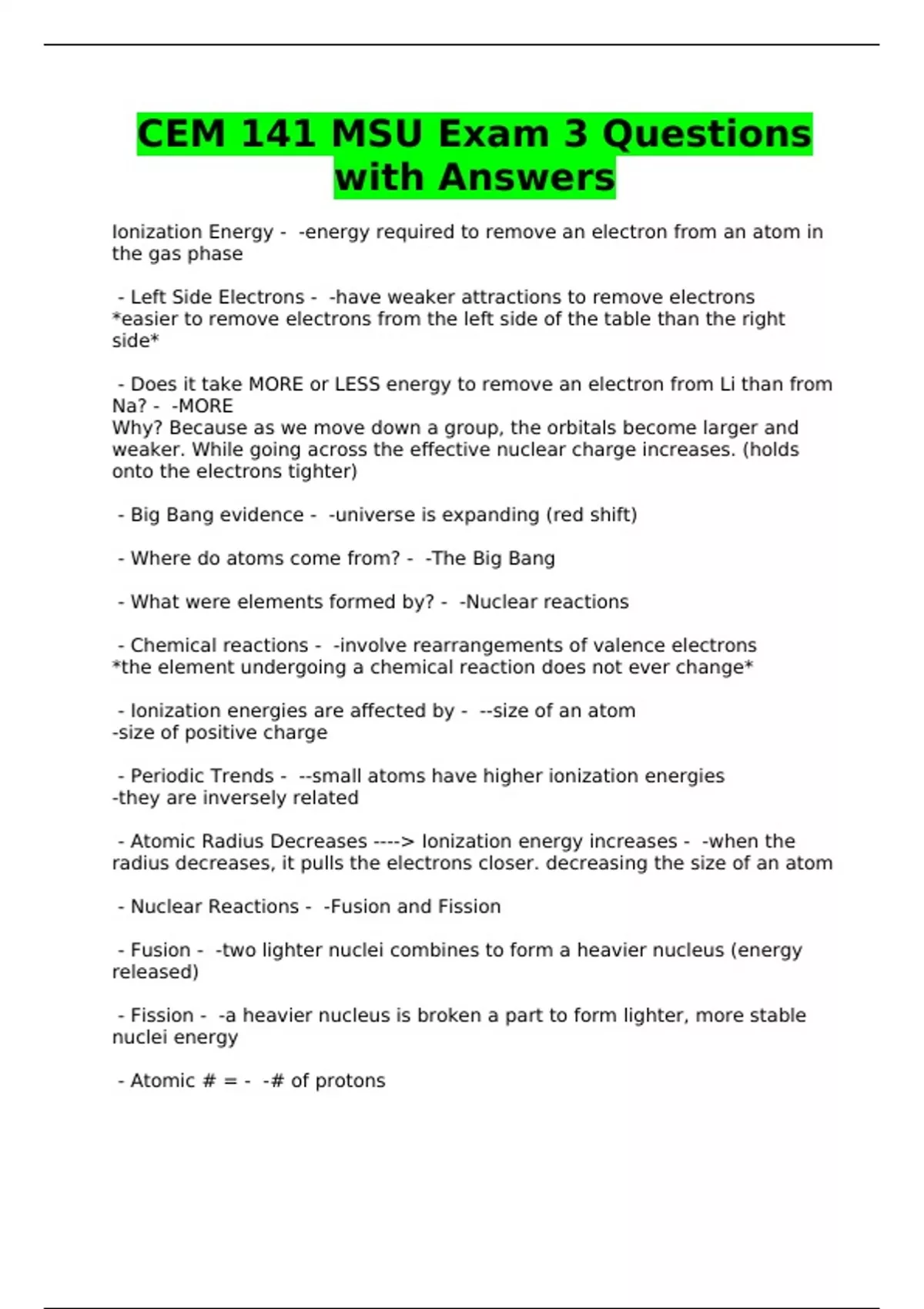 CEM 141 MSU Exam 3 Questions