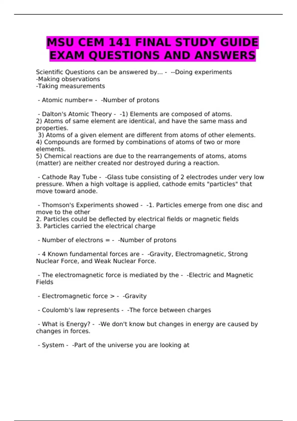 MSU CEM 141 FINAL STUDY GUIDE EXAM QUESTIONS AND ANSWERS