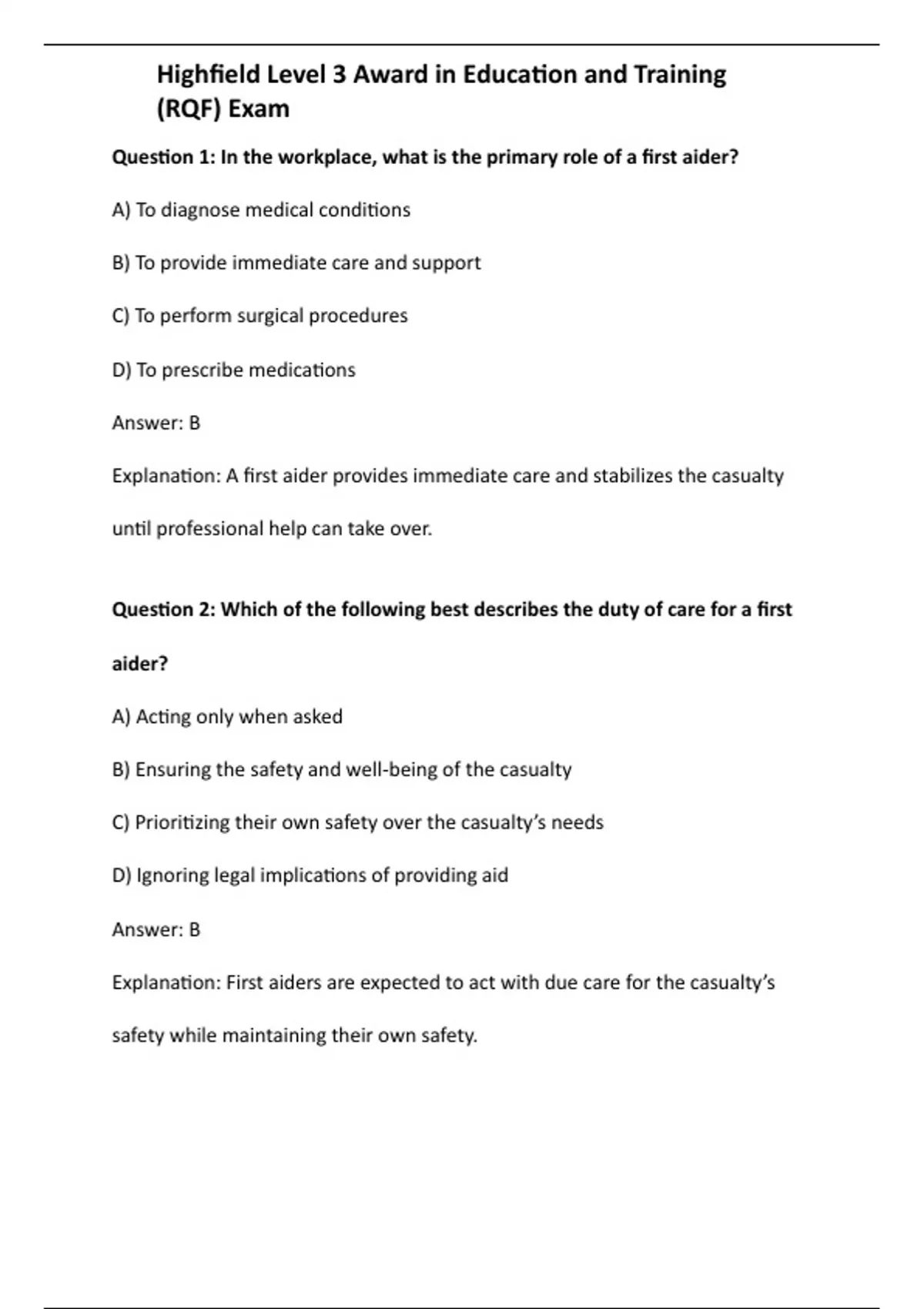 Question 2: Which of the following best describes the duty of care for a first