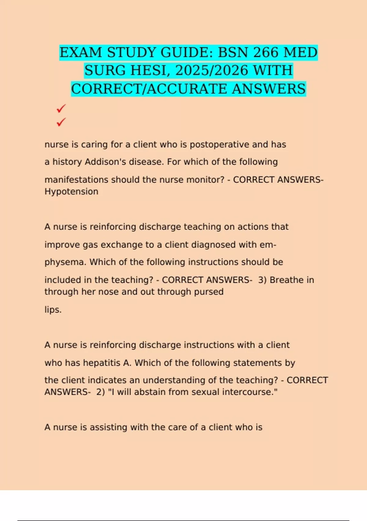 EXAM STUDY GUIDE: BSN 266 MED SURG HESI, 2025/2026 WITH CORRECT/ACCURATE ANSWERS