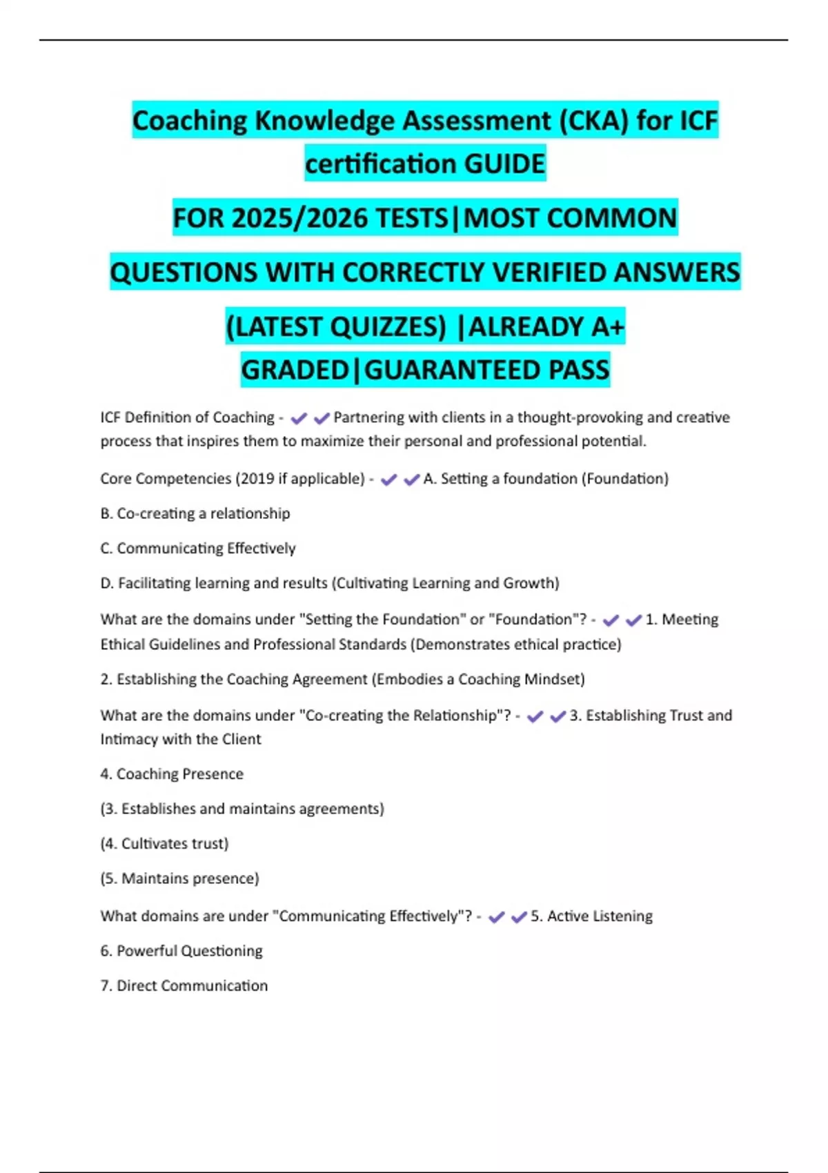 Coaching Knowledge Assessment (CKA) for ICF certification GUIDE FOR 2025/2026 TESTS|MOST COMMON QUESTIONS WITH CORRECTLY VERIFIED ANSWERS (LATEST QUIZZES) |ALREADY A+ GRADED|GUARANTEED PASS