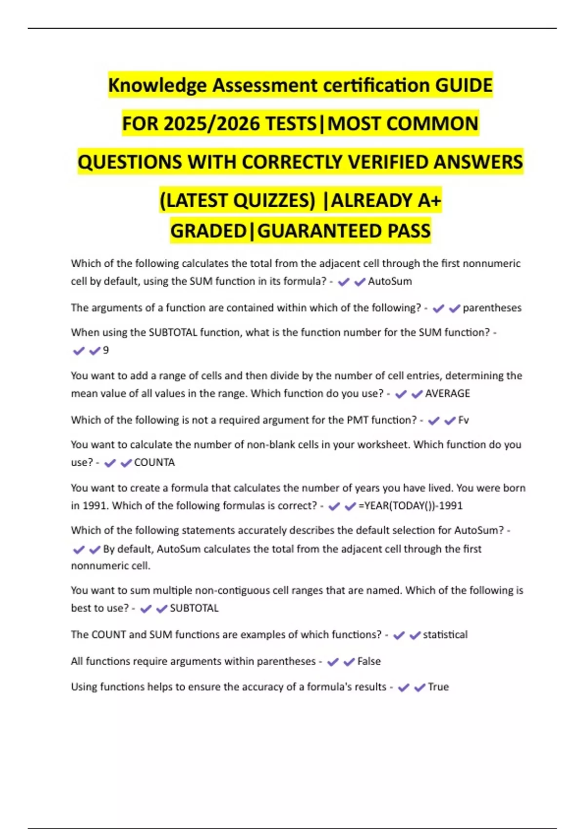 Knowledge Assessment certification GUIDE FOR 2025/2026 TESTS|MOST COMMON QUESTIONS WITH CORRECTLY VERIFIED ANSWERS (LATEST QUIZZES) |ALREADY A+ GRADED|GUARANTEED PASS