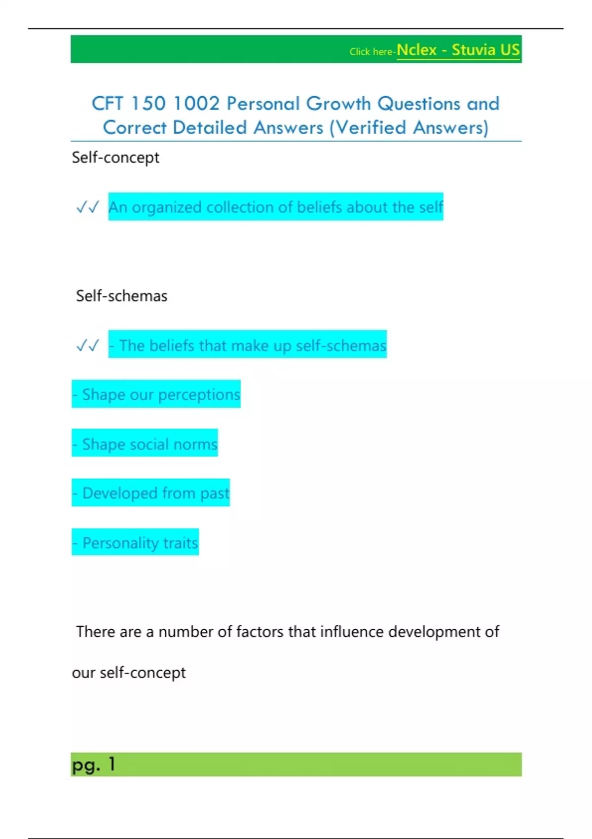 Self-concept An organized collection of beliefs about the self Self-schemas - The beliefs that make up self-schemas - Shape our perceptions - Shape social norms - Developed from past - Personality traits There are a number of factors that influence development of our self-concept pg. 1 Click here-Nclex - Stuvia US - Comparison - Feedback - Values - Norms high self-esteem Positive self image, having confidence low self-esteem Discounting positive information and assuming the worst about self, situation, and the future Microsystems pg. 2 Click here-Nclex - Stuvia US elements of the person's immediate surroundings, such as family and peer group Mesosystems