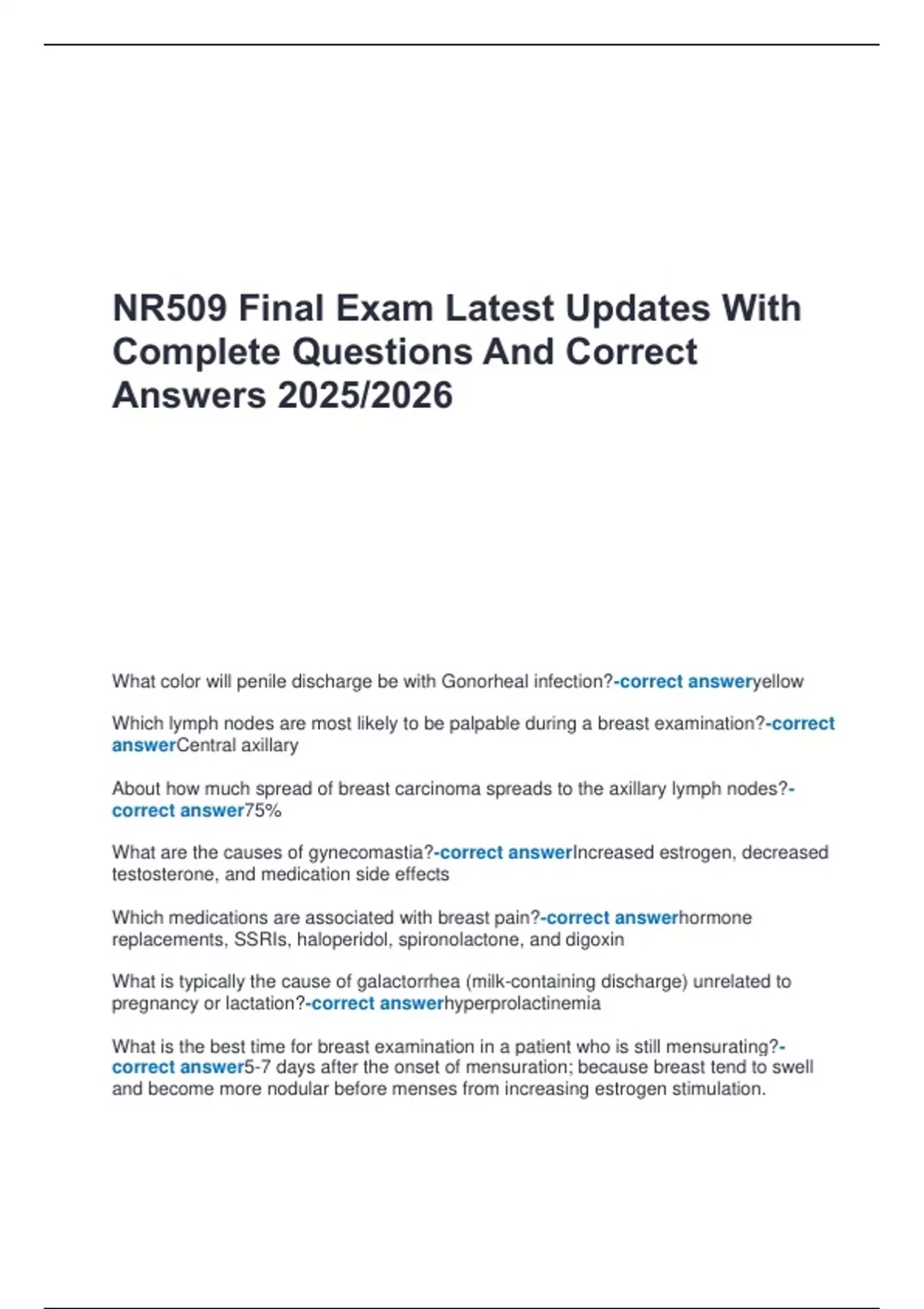 NR509 Final Exam Latest Updates With Complete Questions And Correct Answers 2025/2026 What color will penile discharge be with Gonorheal infection?-correct answeryellow