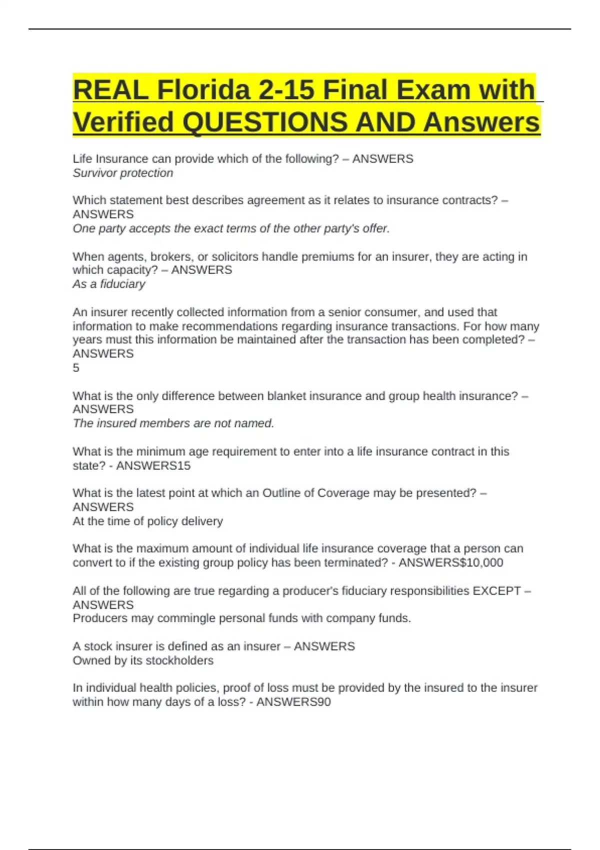 REAL Florida 2-15 Final Exam with Verified QUESTIONS AND Answers