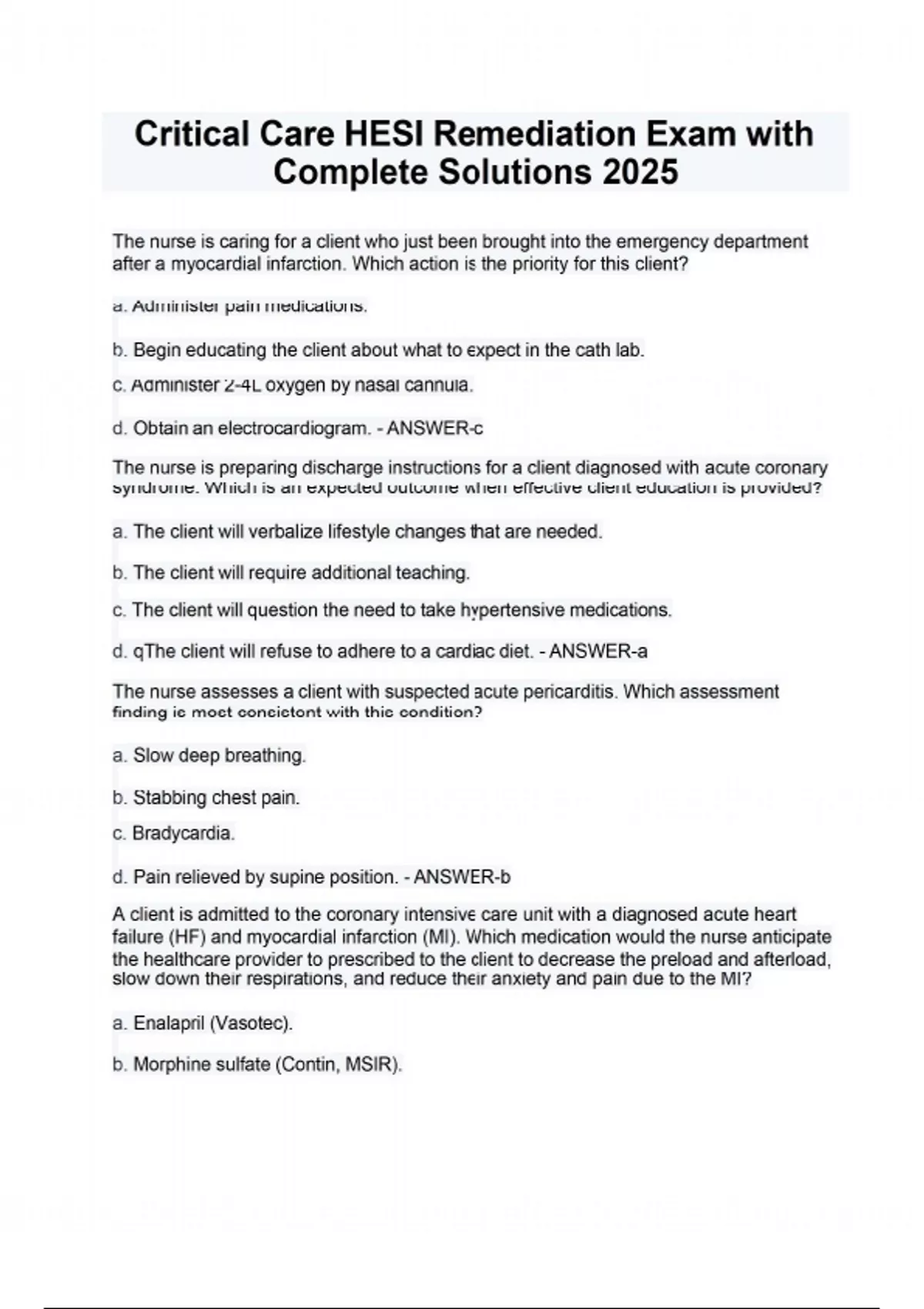 The nurse is caring for a client who just been brought into the emergency department after a myocardial infarction. Which action is the priority for this client? a. Administer pain medications. b. Begin educating the client about what to expect in the cath lab. c. Administer 2-4L oxygen by nasal cannula. d. Obtain an electrocardiogram. - ANSWER-c The nurse is preparing discharge instructions for a client diagnosed with acute coronary syndrome. Which is an expected outcome when effective client education is provided? a. The client will verbalize lifestyle changes that are needed. b. The client will require additional teaching. c. The client will question the need to take hypertensive medications. d. qThe client will refuse to adhere to a cardiac diet. - ANSWER-a The nurse assesses a client with suspected acute pericarditis. Which assessment finding is most consistent with this condition? a. Slow deep breathing. b. Stabbing chest pain. c. Bradycardia. d. Pain relieved by supine position. - ANSWER-b A client is admitted to the coronary intensive care unit with a diagnosed acute heart failure (HF) and myocardial infarction (MI). Which medication would the nurse anticipate the healthcare provider to prescribed to the client to decrease the preload and afterload, slow down their respirations, and reduce their anxiety and pain due to the MI? a. Enalapril (Vasotec). b. Morphine sulfate (Contin, MSIR). Critical Care HESI Remediation Exam with Complete Solutions 2025 c. Hydrochlorothiazide (HCTZ, Urozide). d. Diazepam (Valium, Diastat, Diazemuls). - ANSWER-b The nurse is planning care for a client who was just diagnosed with acute pericarditis. Which screening test should the nurse educate the client about? a. Creatinine clearance. b. 12-lead electrocardiogram. c. Dobutamine stress test. d. Blood transfusion. - ANSWER-b An unstable client with hyperglycemic hyperosmolar syndrome (HHS) has been assigned to the nurse. Which action should the nurse take initially? a. Insert a urinary catheter. b. Prepare to administer isotonic IV fluids. c. Evaluate the client's airway. d. Place two large bore IVs. - ANSWER-c An arterial blood gas (ABG) analysis is drawn for a client. The results show pH of 7.30; PaCO2 of 68 mm Hg and an HCO3 of 24 mEq/L. What should the nurse interpret this blood gas as? a. Compensated metabolic alkalosis. b. Uncompensated respiratory acidosis. c. Compensated metabolic acidosis. d. Uncompensated respiratory alkalosis. - ANSWER-b The nurse is assessing a client who is experiencing shortness of breath, intercostal retractions, nasal flaring, inspiratory and expiratory wheezing, who has not not shown any respiratory improvement after two administrations of albuterol nebulizer treatments. Which is a common trigger for acute asthma exacerbation? a. Ingested allergen. b. Exposure to warm air. c. Hypocapnia. d. Inactivity. - ANSWER-a When caring for a client with acute coronary syndrome, which action should the nurse take to reduce the risk of further injury? a. Be prepared to begin antithrombin therapy. b. Begin discharge education on diet. c. Increase the client's physical activity. d. Stop intravenous fluids. - ANSWER-a client is admitted to the coronary intensive care unit with a diagnosed acute heart failure (HF) and myocardial infarction (MI). Which medication would the nurse anticipate the healthcare provider to prescribed to the client to decrease the preload and afterload, slow down their respirations, and reduce their anxiety and pain due to the MI? a. Enalapril (Vasotec). b. Morphine sulfate (Contin, MSIR). c. Hydrochlorothiazide (HCTZ, Urozide). d. Diazepam (Valium, Diastat, Diazemuls). - ANSWER-b The nurse performs a 12-lead electrocardiogram (ECG) on a client who is in the first hour of care after a myocardial infarction (MI). The client's T-waves appear tall and peaked. How should the nurse interpret this finding? a. This is a normal finding in the first hour after an MI. b. This is a warning sign for an impending massive heart attack. c. This as abnormal because T-waves are typically inverted during an acute MI. d. This tracing should be compared with a previous 12-lead ECG prior to interpretation. - ANSWER-a The nurse is preparing a client for discharge after a percutaneous coronary intervention. Which statement by the client indicates that teaching has been effective? a. "I no longer need medications now that I am all cleaned out." b. "I should report fainting to my cardiologist." c. "I'll follow up with my cardiologist if needed." d. "I should begin exercising once I return home." - ANSWER-b The nurse is assessing a young adult client who reports joint discomfort and pain. Upon inspection the nurse notes the client has very long hands and feet, and a very tall, thin build. On physical assessment, the nurse identifies a mitral valve murmur and scoliosis. Which condition is consistent with the nurse's assessment? a. Marfan syndrome. b. Cushing's syndrome. c. Fibromyalgia syndrome. d. Polymyalgia rheumatic syndrome. - ANSWER-a The nurse is caring for a client who is at risk for developing pneumonia. Which action should the nurse take to decrease the risk of infection? a. Encourage the client to stay in bed and rest. b. Maintain an option suction system when suctioning the client. c. Teach the client how to cough and deep breathe. d. Implement protective isolation precautions. - ANSWER-c Which statement is true about the development of the complication of primary spontaneous pneumothorax? a. "It generally occurs during pregnancy." b. "It is a life-threatening condition." c. "It occurs more often in men who smoke." d. "It occurs during exercise." - ANSWER-c Which assessment finding should the nurse anticipate in a client experiencing an acute asthma exacerbation? a. Decreased nasal secretions. b. Frequent productive cough. c. Answering questions in full sentences. d. Prolonged phase of forced expiration. - ANSWER-d What is the highest priority of nursing care in ventilator ma