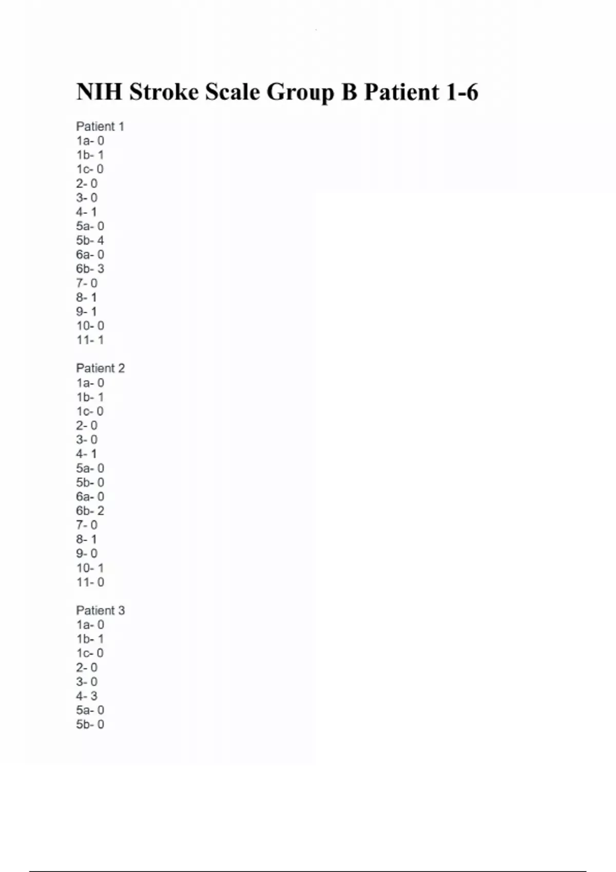 NIH Stroke Scale Group B Patient 1-6 Patient 1 1a- 0 1b- 1 1c- 0 2- 0 3- 0 4- 1 5a- 0 5b- 4 6a- 0 6b- 3 7- 0 8- 1 9- 1 10- 0 11- 1 Patient 2 1a- 0 1b- 1 1c- 0 2- 0 3- 0 4- 1 5a- 0 5b- 0 6a- 0 6b- 2 7- 0 8- 1 9- 0 10- 1 11- 0