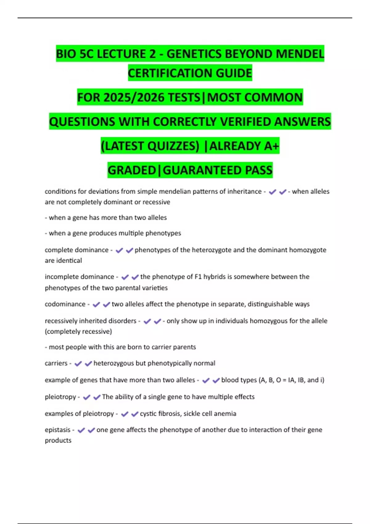 Study smarter with the BIO 5C LECTURE 2 - GENETICS BEYOND MENDEL latest assessment bundle. Correct, verified answers matched to the 2025/26 curriculum. Perfect for students aiming for an A+.
