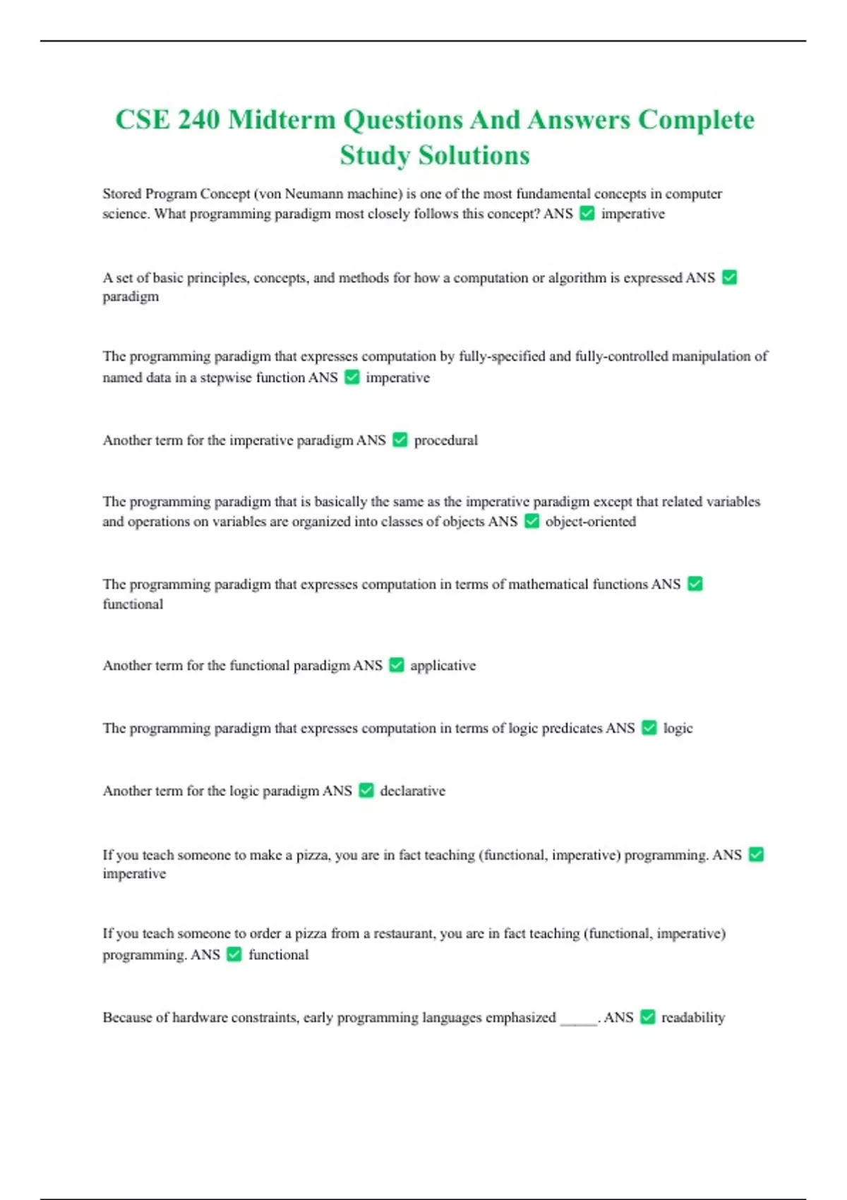 CSE 240 Midterm Questions And Answers Complete Study Solutions Stored Program Concept (von Neumann machine) is one of the most fundamental concepts in computer science. What programming paradigm most closely follows this concept? ANS imperative A set of basic principles, concepts, and methods for how a computation or algorithm is expressed ANS paradigm The programming paradigm that expresses computation by fully-specified and fully-controlled manipulation of named data in a stepwise function ANS imperative Another term for the imperative paradigm ANS procedural The programming paradigm that is basically the same as the imperative paradigm except that related variables and operations on variables are organized into classes of objects ANS object-oriented The programming paradigm that expresses computation in terms of mathematical functions ANS functional Another term for the functional paradigm ANS applicative The programming paradigm that expresses computation in terms of logic predicates ANS logic Another term for the logic paradigm ANS declarative If you teach someone to make a pizza, you are in fact teaching (functional, imperative) programming. ANS imperative If you teach someone to order a pizza from a restaurant, you are in fact teaching (functional, imperative) programming. ANS functional Because of hardware constraints, early programming languages emphasized _____. ANS readability The main idea of structured programming is to A) increase the types of control structures, B) make programs execute faster, C) reduce the types of control structures, D) use BNF to define the syntactic structure. ANS C A meta language that can be used to define the lexical and syntactic structures of another language ANS Backus-Naus Form Which programmi