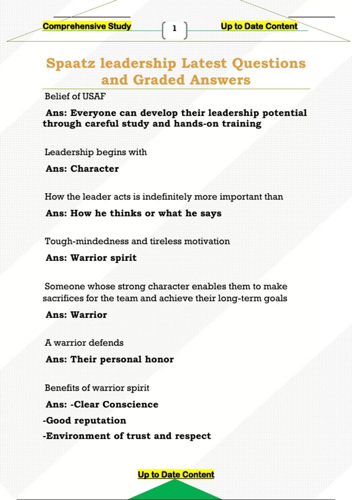 Spaatz leadership Latest Questions and Graded Answers Belief of USAF Ans: Everyone can develop their leadership potential through careful study and hands-on training Leadership begins with Ans: Character