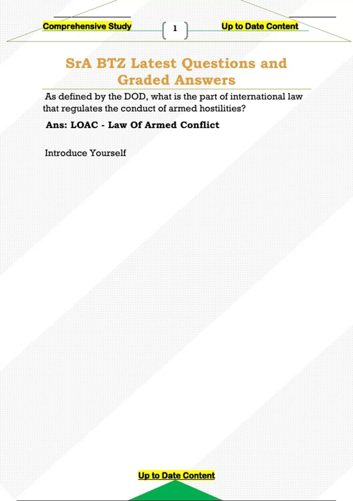 SrA BTZ Latest Questions and Graded Answers As defined by the DOD, what is the part of international law that regulates the conduct of armed hostilities? Ans: LOAC - Law Of Armed Conflict Introduce Yourself
