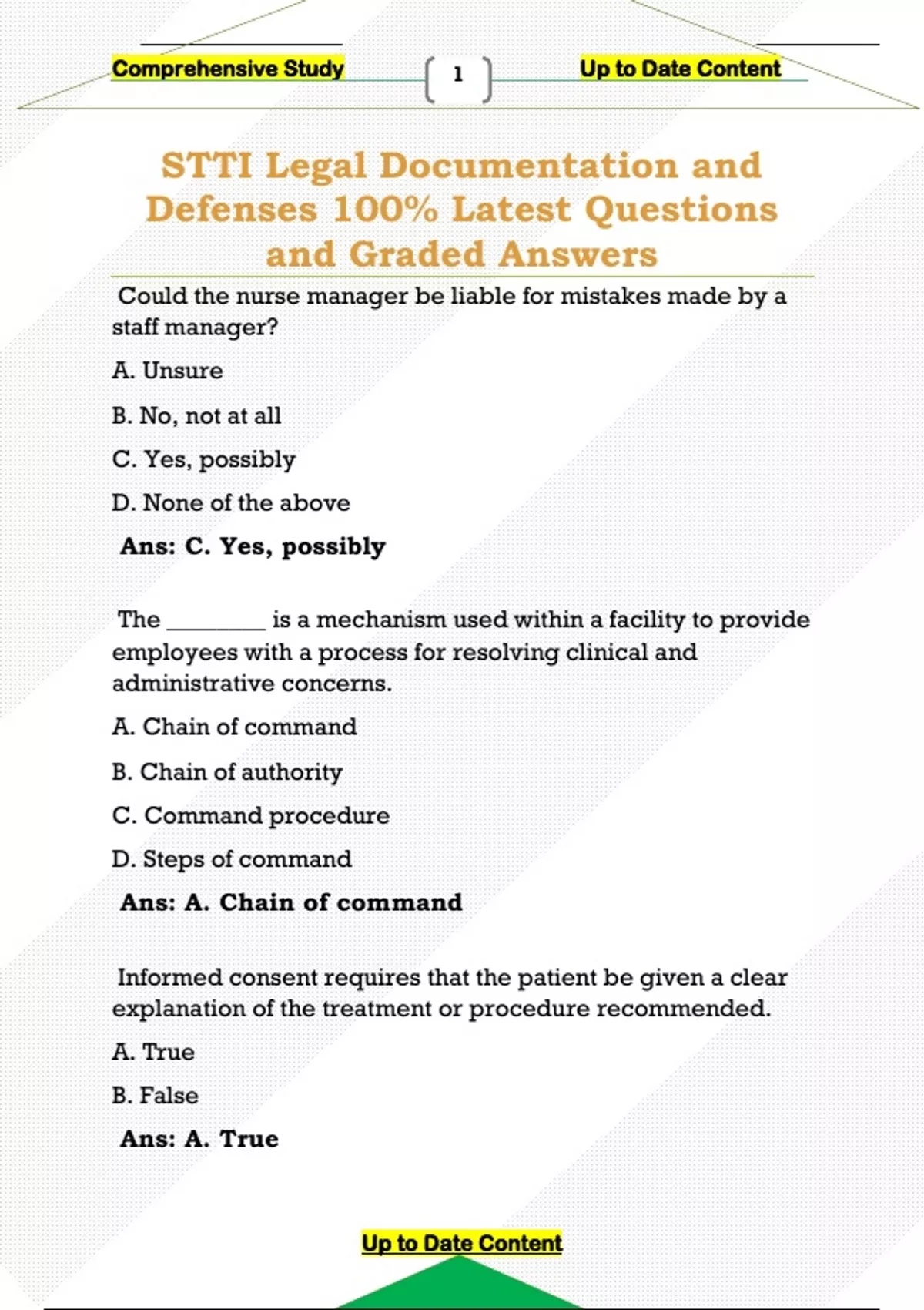 STTI Legal Documentation and Defenses 100% Latest Questions and Graded Answers Could the nurse manager be liable for mistakes made by a staff manager? A. Unsure B. No, not at all C. Yes, possibly D. None of the above Ans: C. Yes, possibly
