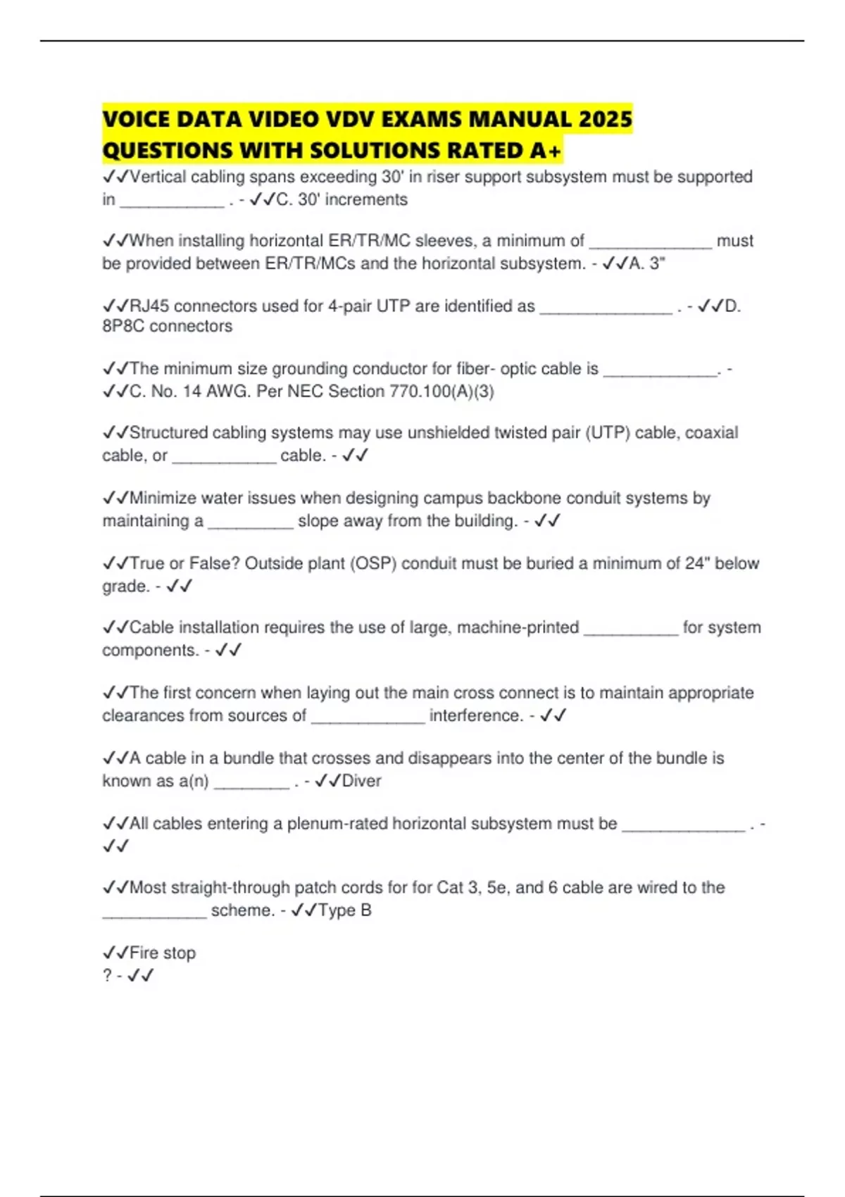 ✔✔Vertical cabling spans exceeding 30' in riser support subsystem must be supported