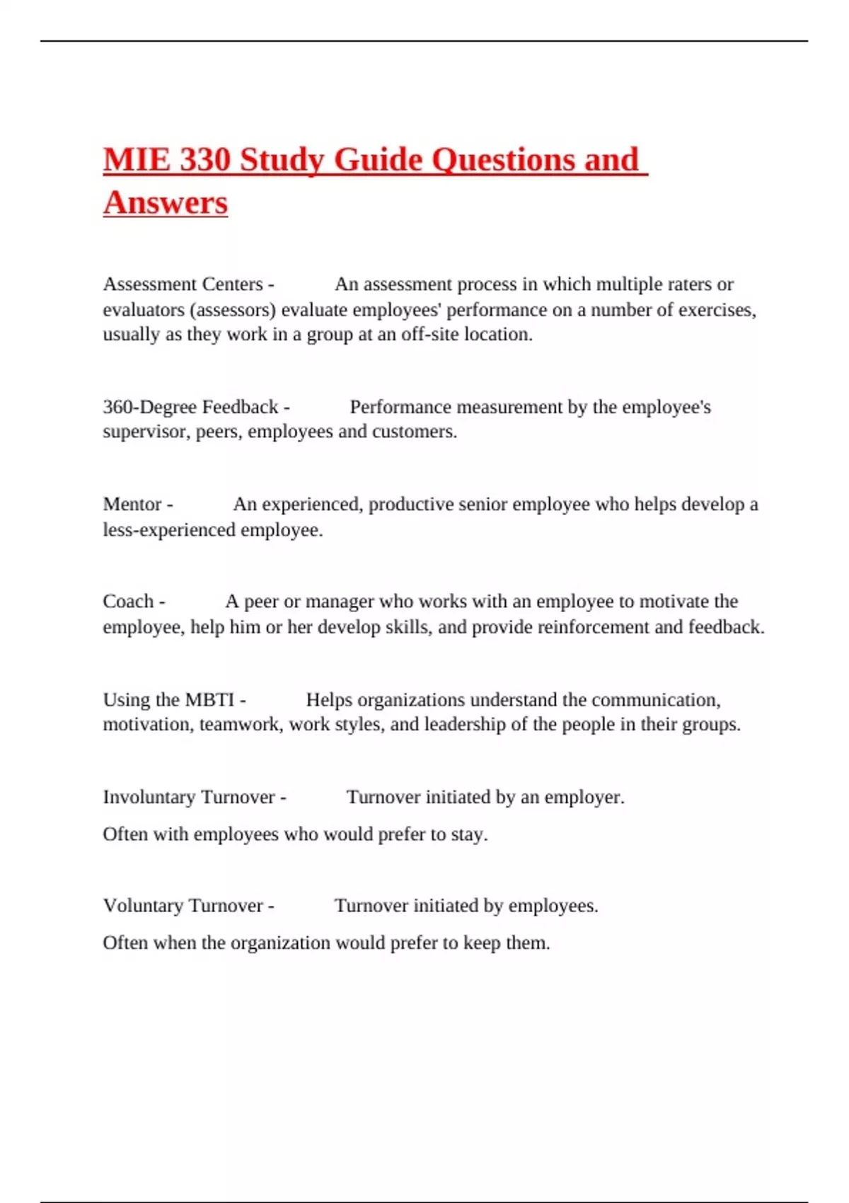 Assessment Centers - An assessment process in which multiple raters or evaluators (assessors) evaluate employees' performance on a number of exercises, usually as they work in a group at an off-site location. 360-Degree Feedback - Performance measurement by the employee's supervisor, peers, employees and customers. Mentor - An experienced, productive senior employee who helps develop a less-experienced employee. Coach - A peer or manager who works with an employee to motivate the employee, help him or her develop skills, and provide reinforcement and feedback. Using the MBTI - Helps organizations understand the communication, motivation, teamwork, work styles, and leadership of the people in their groups. Involuntary Turnover - Turnover initiated by an employer. Often with employees who would prefer to stay. Voluntary Turnover - Turnover initiated by employees. Often when the organization would prefer to keep them. Distributive Justice - A judgment that the consequences given to employees are just. Procedural Justice - A judgment that fair methods were used to determine the consequences an employee receives. Interactional Justice - A judgment that the organization carried out its actions in a way that took the employee's feelings into account. Legal Requirements - -Wrongful Discharge -Discrimination -Employees' Privacy -Notification of layoffs Simple Ranking - Requires managers to rank employees in their group from the highest performer to the poorest performer.