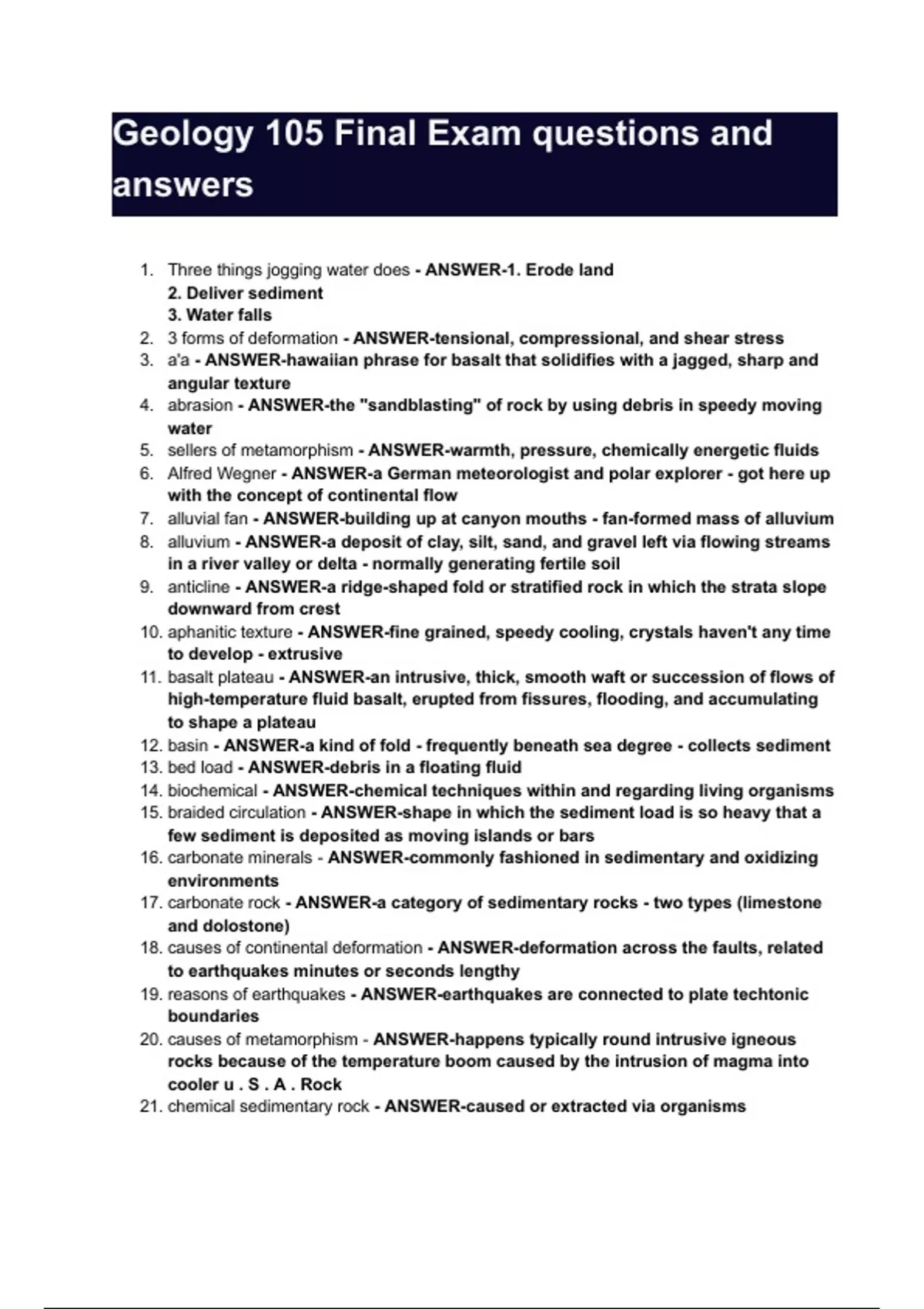 Geology 105 Final Exam questions and