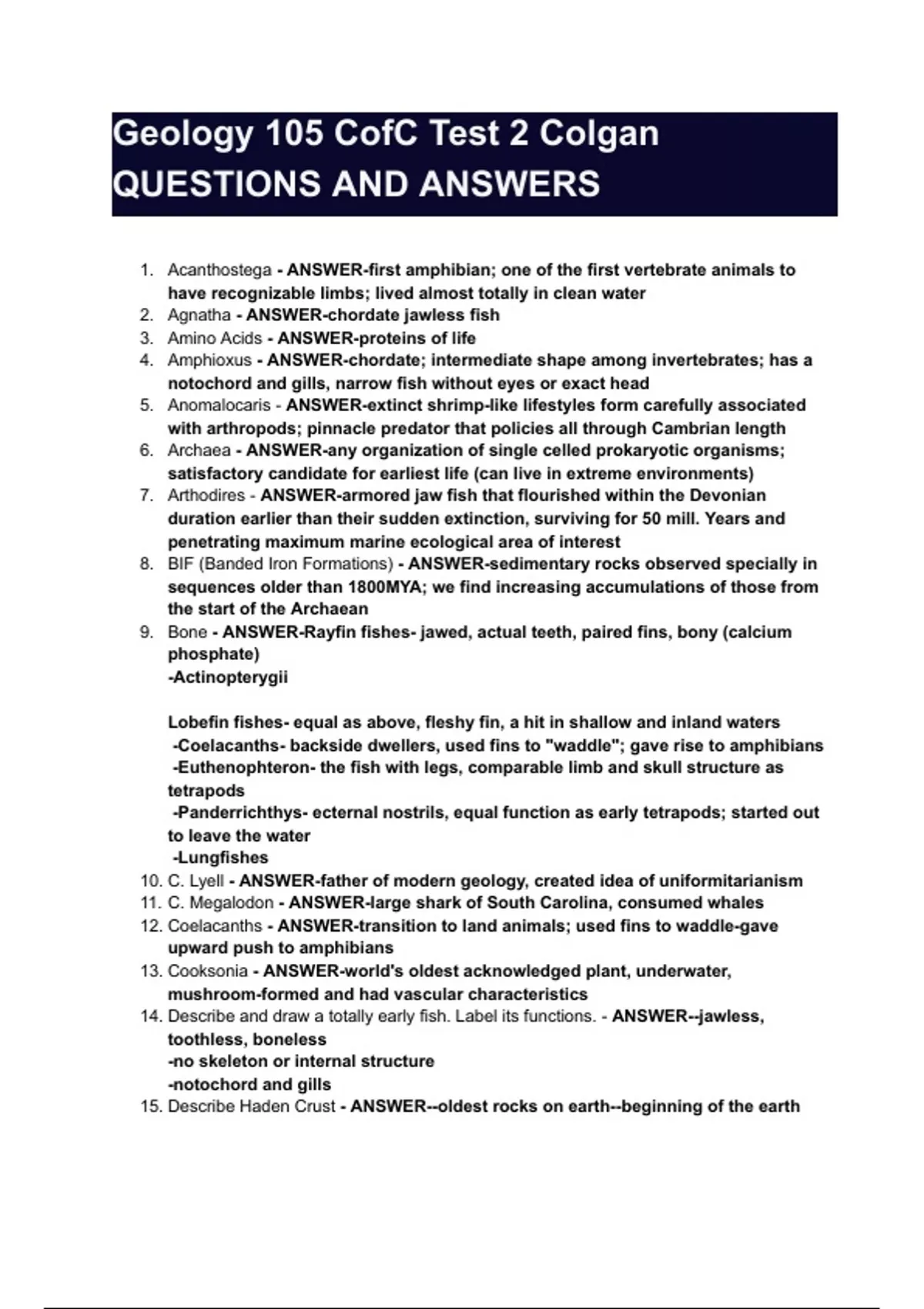 Geology 105 CofC Test 2 Colgan QUESTIONS AND ANSWERS