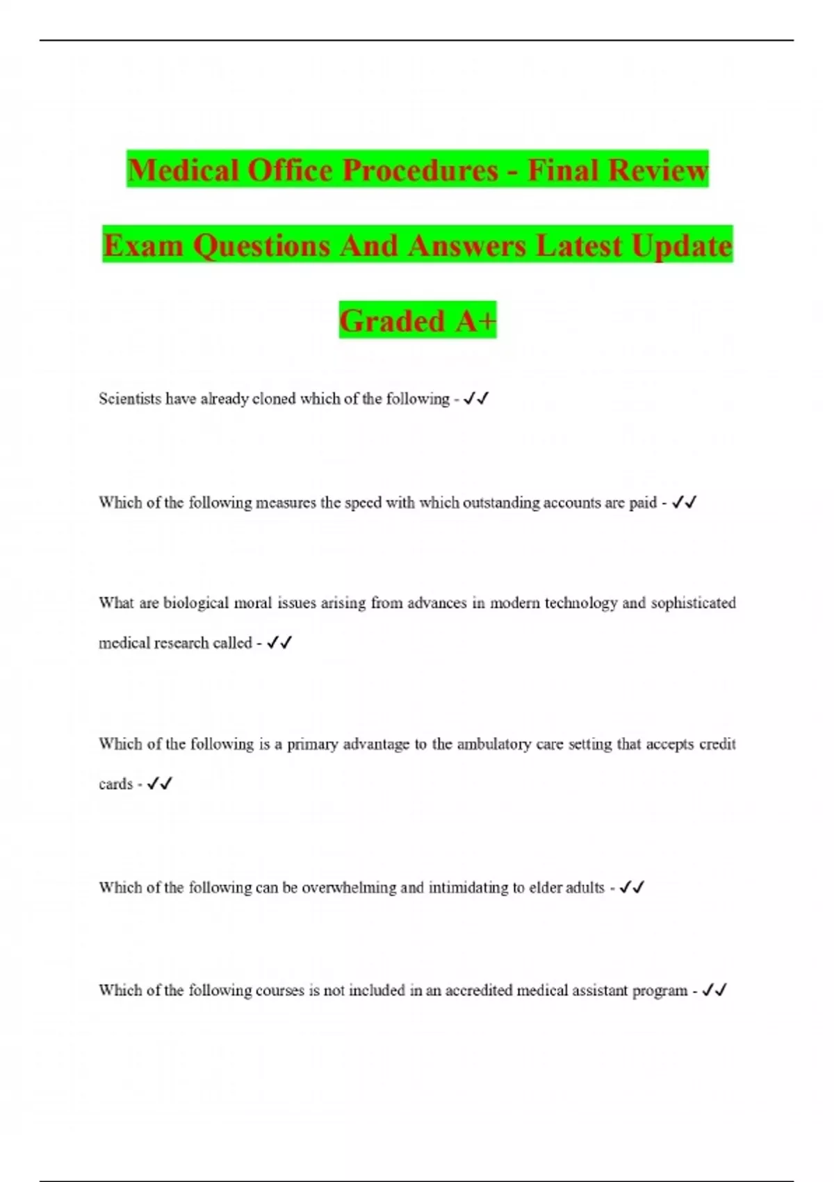 Medical Office Procedures - Final Review Exam Questions And Answers Latest Update Graded A+
