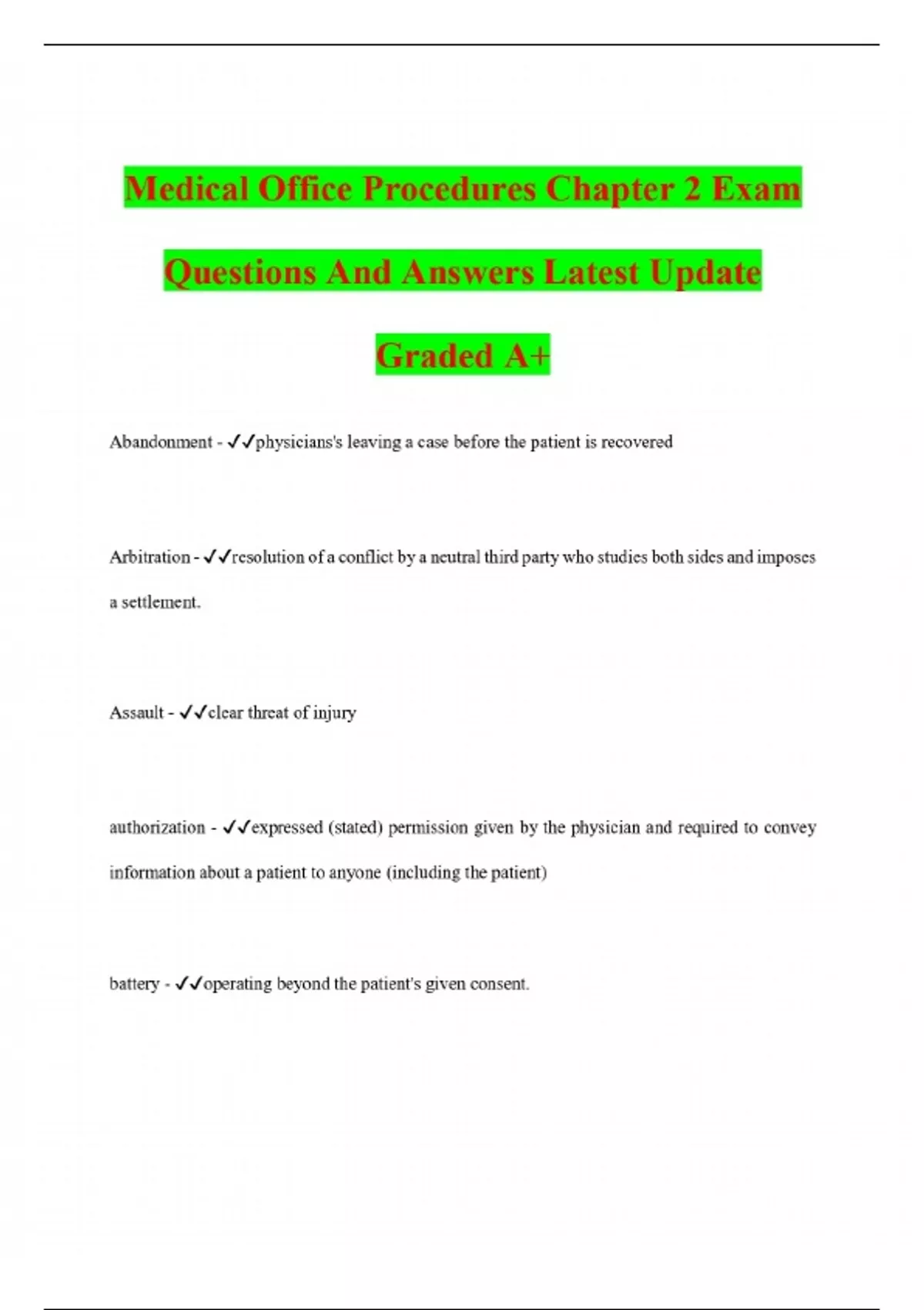 Medical Office Procedures Chapter 2 Exam Questions And Answers Latest Update Graded A+