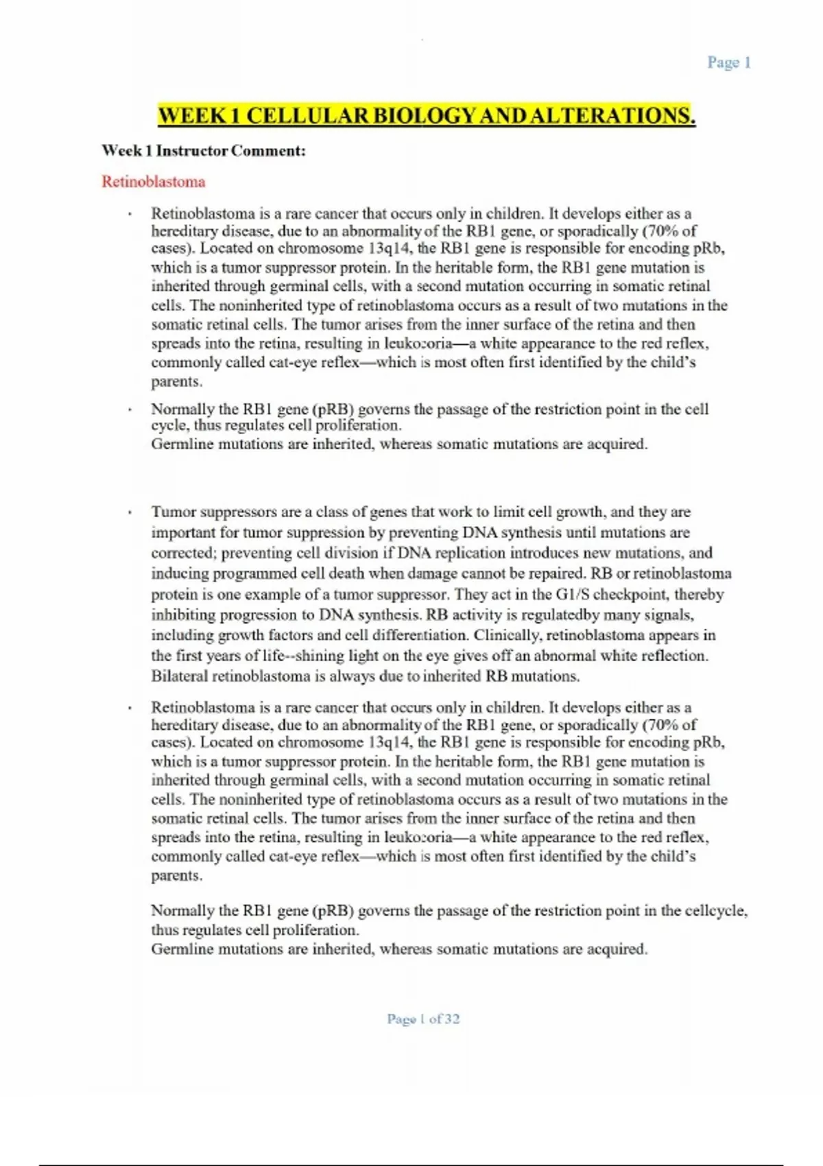 WEEK 1 CELLULAR BIOLOGY AND ALTERATIONS.