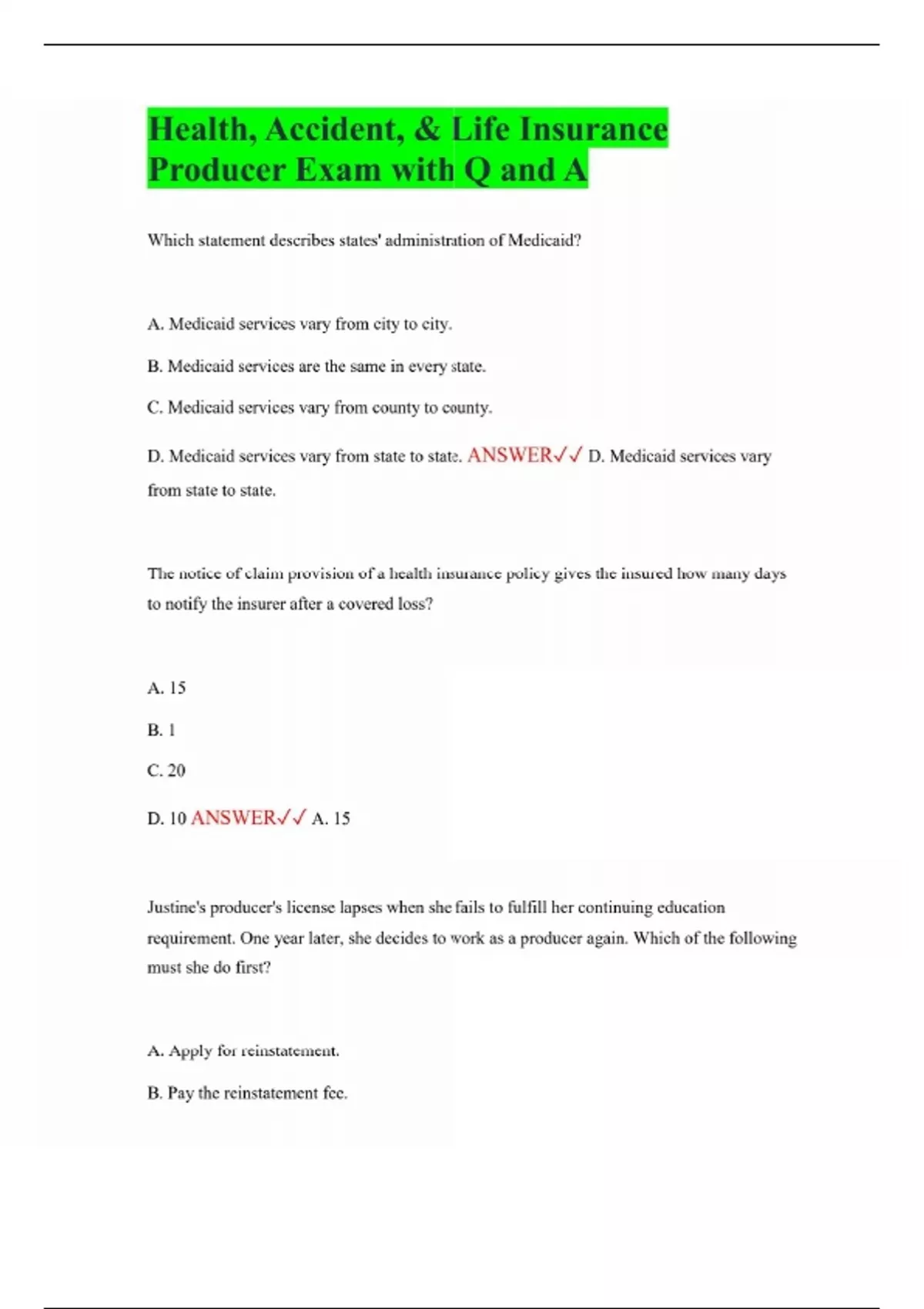 Health, Accident, & Life Insurance Producer Exam with Q and A Which statement describes states' administration of Medicaid? A. Medicaid services vary from city to city. B. Medicaid services are the same in every state. C. Medicaid services vary from county to county. D. Medicaid services vary from state to state. ANSWER D. Medicaid services vary from state to state. The notice of claim provision of a health insurance policy gives the insured how many days to notify the insurer after a covered loss? A. 15 B. 1 C. 20 D. 10 ANSWER A. 15 Justine's producer's license lapses when she fails to fulfill her continuing education requirement. One year later, she decides to work as a producer again. Which of the following must she do first? A. Apply for reinstatement. B. Pay the reinstatement fee.