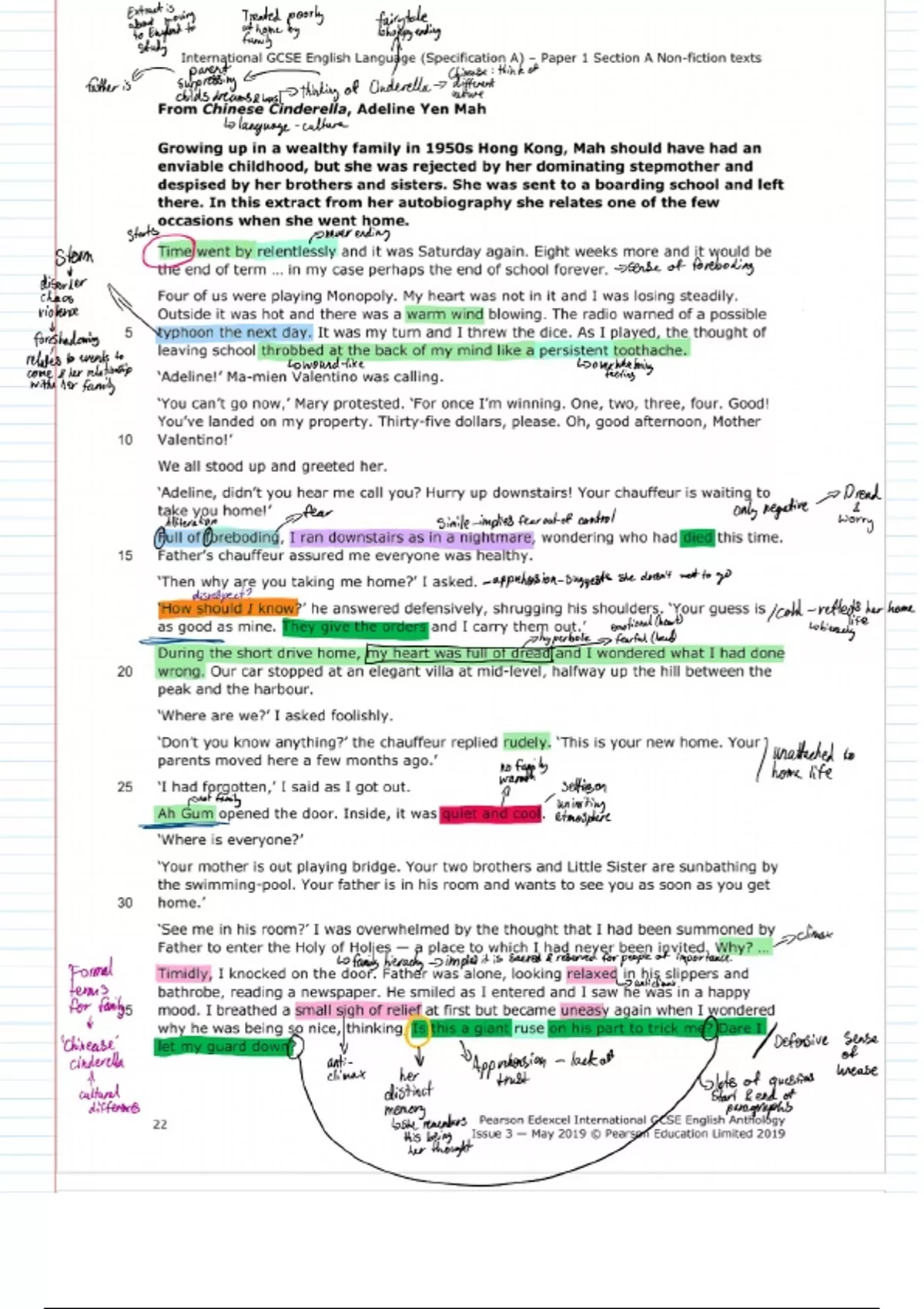 For Pearson Edexcel IGCSE English Language (specification A). From: Part 1: Paper 1 Section A Non-fiction texts. Chinese Cinderella by Adeline Yen Mah annotated text. (If any of the annotations are illegible/too small to read, message me and I'll send a close-up or tell you what I meant to write)