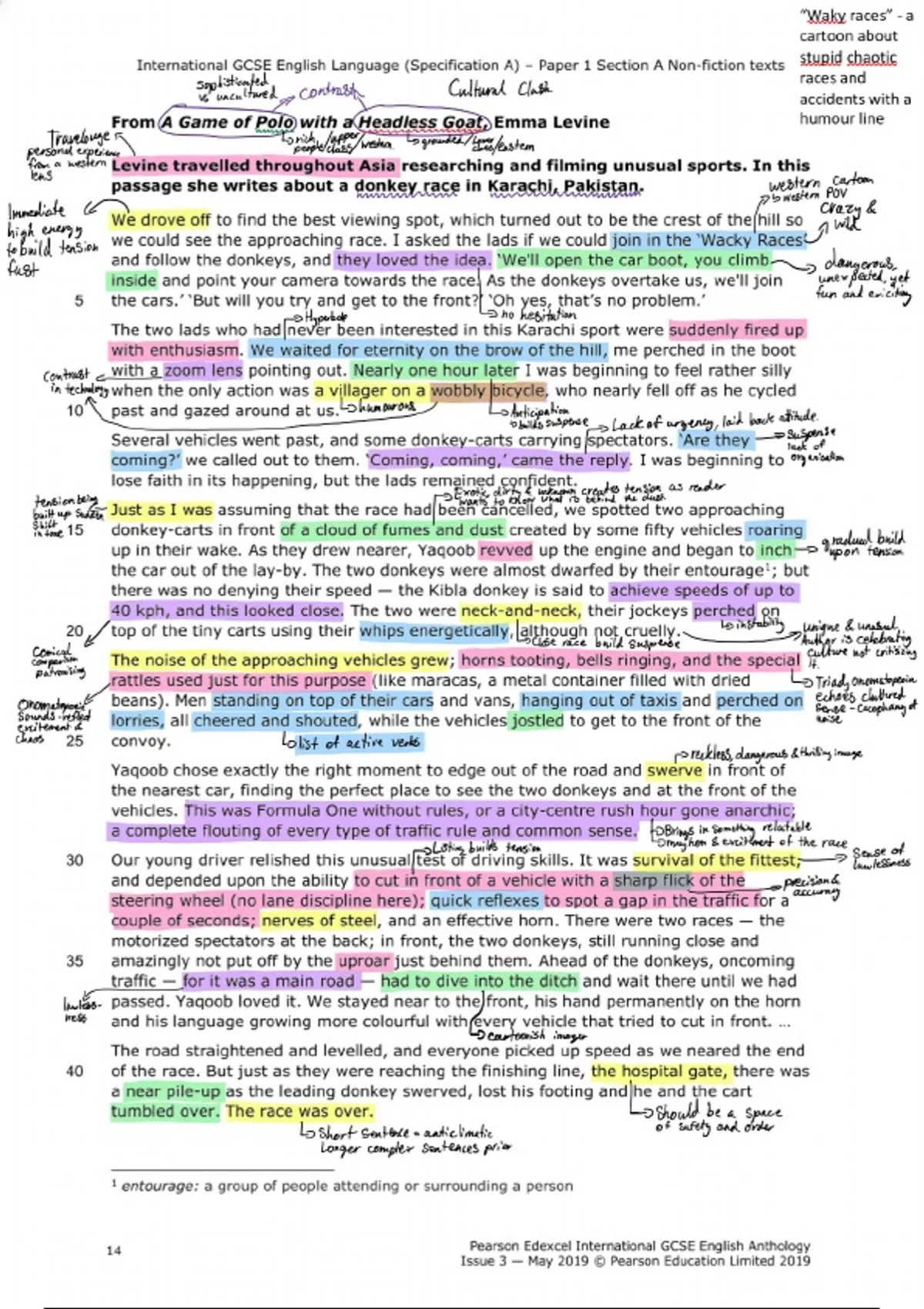 For Pearson Edexcel IGCSE English Language (specification A). From: Part 1: Paper 1 Section A Non-fiction texts. A game of polo with a headless goat by Emma Levine annotated text. (If any of the annotations are illegible/too small to read, message me and I'll send a close-up or tell you what I meant to write)