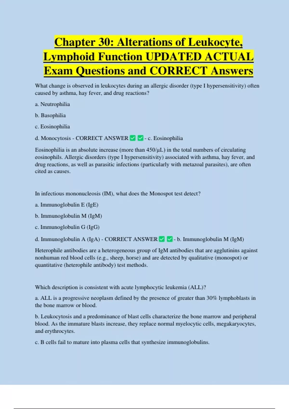 Chapter 30: Alterations of Leukocyte, Lymphoid Function UPDATED ACTUAL Exam Questions and CORRECT Answers What change is observed in leukocytes during an allergic disorder (type I hypersensitivity) often caused by asthma, hay fever, and drug reactions? a. Neutrophilia b. Basophilia c. Eosinophilia d. Monocytosis - CORRECT ANSWER - c. Eosinophilia