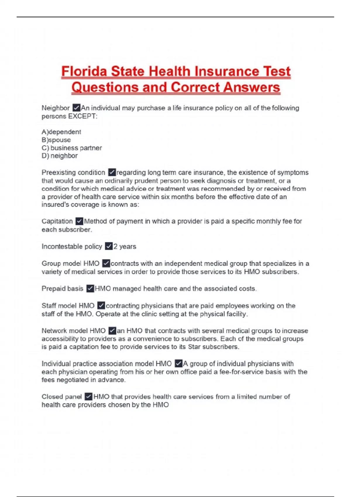 Florida Life Insurance State Exam Simulator Questions and Correct Answers Post-tax dollar contributions are found in Roth IRA investments N purchases an annuity by making payments in an amount no less than $100 quarterly. This describes which of the following annuities? Flexible installment deferred Q applied for life insurance and submitted the initial premium on January 1. The policy was issued February 1, but it was not delivered by the agent until February 7. Q is dissatisfied and returns the policy February 13. How will the insurer handle this situation? Policy was returned within the free look period, premium will be fully refunded Traditional individual retirement annuity distributions must start by April 1st of the year following the year the participant attains age 70 1/2 What is the underlying concept regarding level premiums? The early years are charged more than what is needed The fundamental reason for regulation of insurance is to protect consumers A policy of Adhesion can only be modified by the insurance company What kind of insurance policy supplies an income stream over a set period of time that starts when the insured dies? Family Maintenance policy A potential client, age 40, would like to purchase a Whole Life policy that will accumulate cash value at a faster rate in the early years of the policy. Which of these statements made by the producer would be correct? 20 pay life accumulates cash value faster than Straight Life What type of life policy has a death benefit that adjusts periodically and is written for a specific period of time? Decreasing term On delivery of a policy, a signed statement of good health is typically requested if: The application was submitted without the initial premium A potential client, age 40, would like to purchase a Whole Life policy that will accumulate cash value at a faster rate in the early years of the policy. Which of these statements made by the producer would be correct? 20 pay life accumulates cash value faster K purchased a $10,000 Life Policy that will pay the face amount to her if she lives to age 65, or to her beneficiary if she dies before age 65. K purchased which of the following types of policies? Endowment at age 65 Which department oversees 'Market Conduct Examinations' in Florida? Office of Insurance Regulation An insured's inability to perform two or more activities of daily living may trigger which type of policy rider? Long term care K is looking to purchase Renewable Term insurance. Which of these types of Term insurance may be renewable? Level