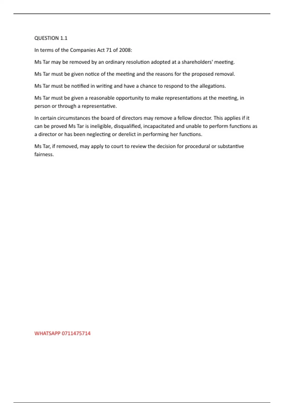Ms Tar may be removed by an ordinary resolution adopted at a shareholders' meeting.