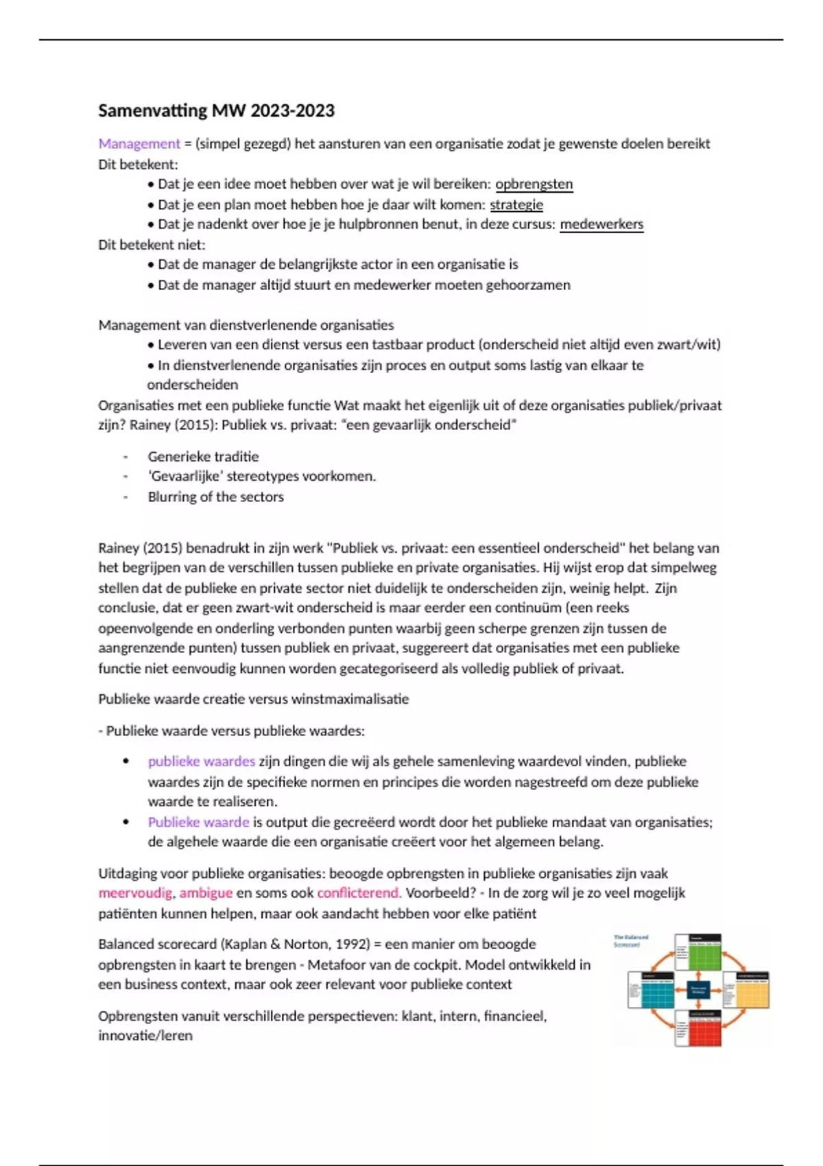 In deze samenvatting staat de stof van artikelen (Rainey, Kaplan, Boselie, etc.), hoorcolleges, werkgroepen duidelijk uitgewerkt. De stof is overzichtelijk en op deze manier simpel te begrijpen. Ik heb zelf een 7,5 voor het tentamen gehaald.