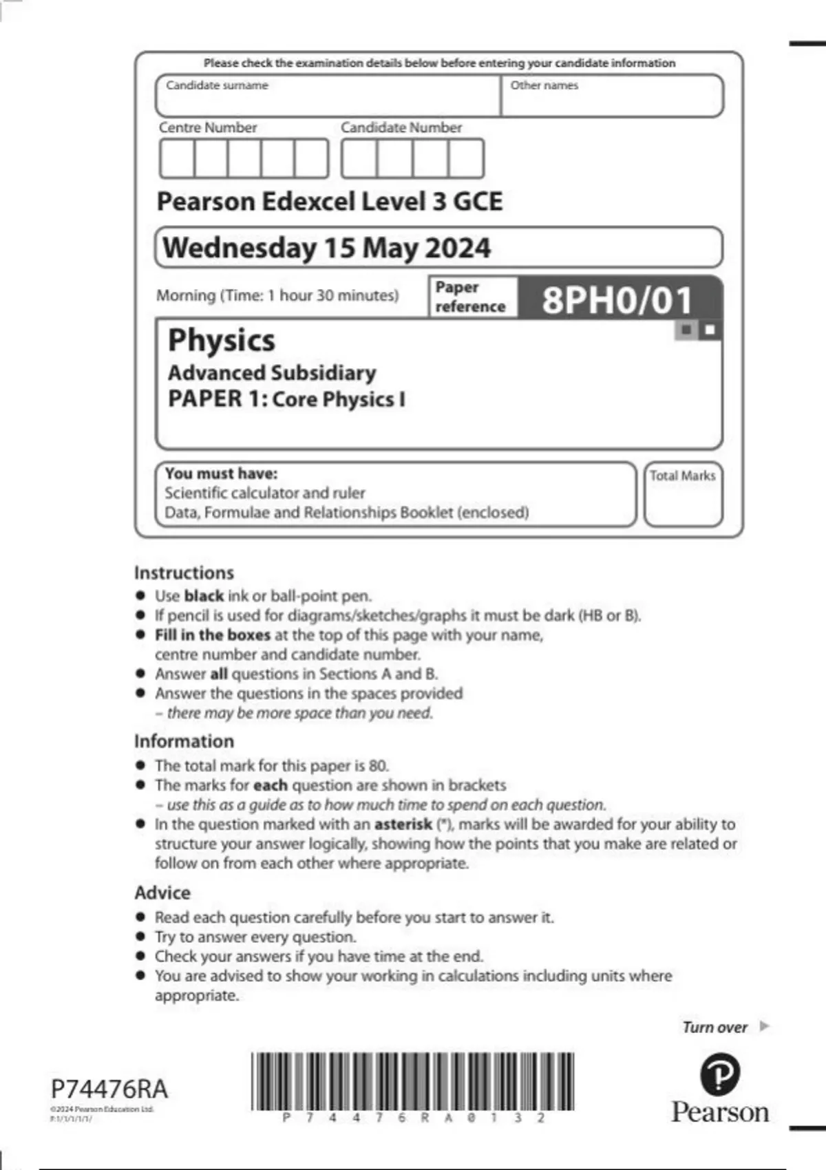 PEARSON EDEXCEL AS LEVEL PHYSIC PAPER 1 JUNE 2024 FINAL QUESTION PAPER