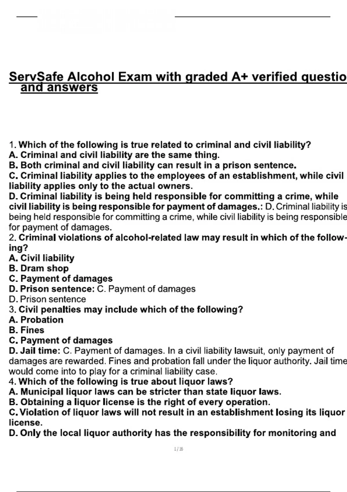 ServSafe Alcohol Exam with graded A+ verified question and answers 1. Which of the following is true related to criminal and civil liability? A. Criminal and civil liability are the same thing. B. Both criminal and civil liability can result in a prison sentence. C. Criminal liability applies to the employees of an establishment, while civil liability applies only to the actual owners. D. Criminal liability is being held responsible for committing a crime, while civil liability is being responsible for payment of damages.: D. Criminal liability is being held responsible for committing a crime, while civil liability is being responsible for payment of damages.