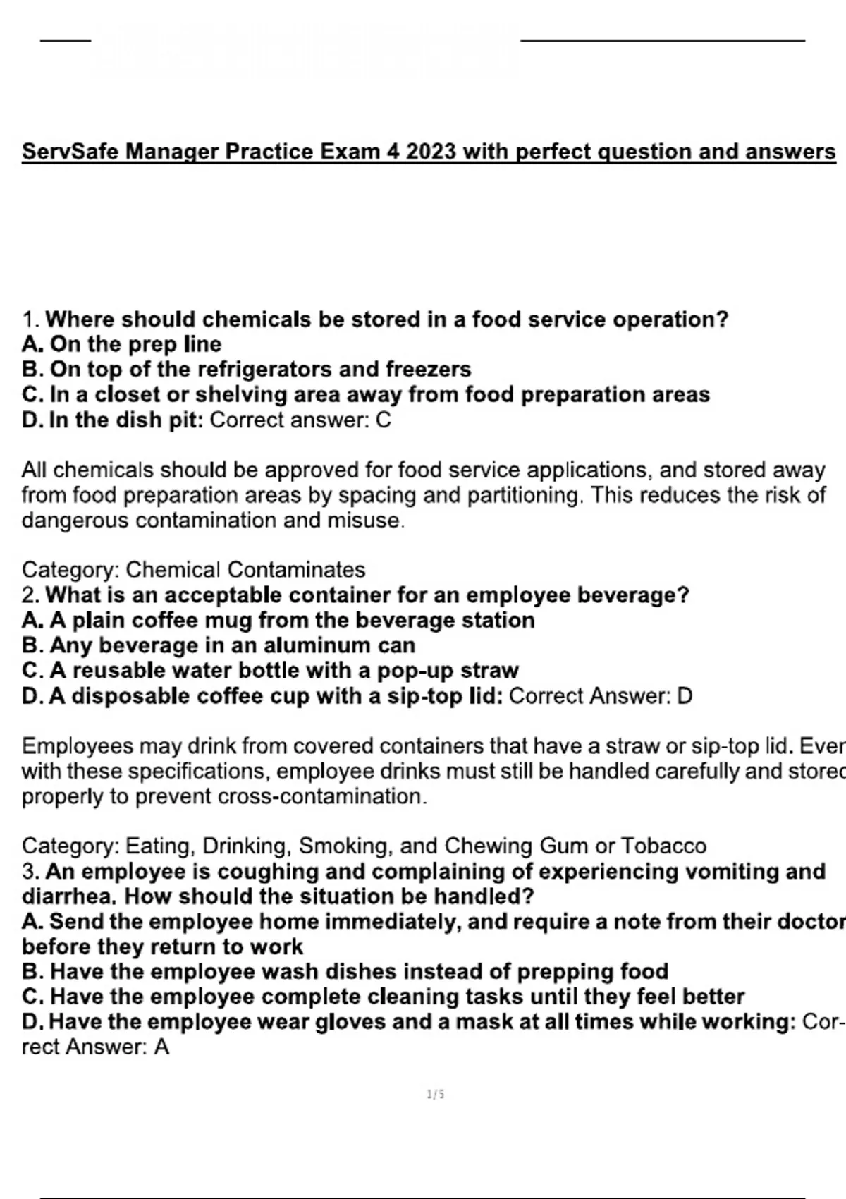 ServSafe Manager Practice Exam 4 2023 with perfect question and answers 1. Where should chemicals be stored in a food service operation? A. On the prep line B. On top of the refrigerators and freezers C. In a closet or shelving area away from food preparation areas D. In the dish pit: Correct answer: C All chemicals should be approved for food service applications, and stored away from food preparation areas by spacing and partitioning. This reduces the risk of dangerous contamination and misuse. Category: Chemical Contaminates