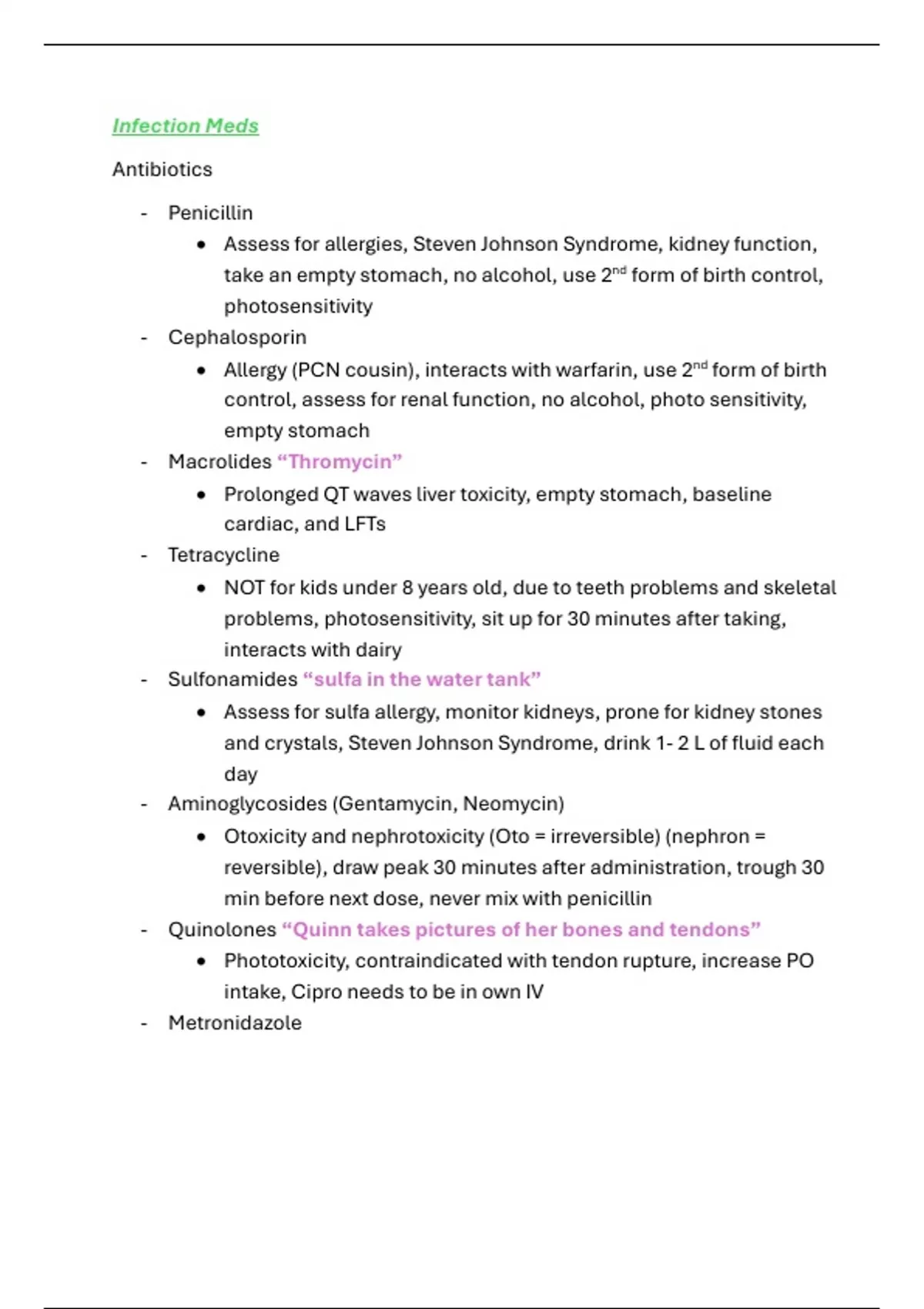 • Assess for allergies, Steven Johnson Syndrome, kidney function,