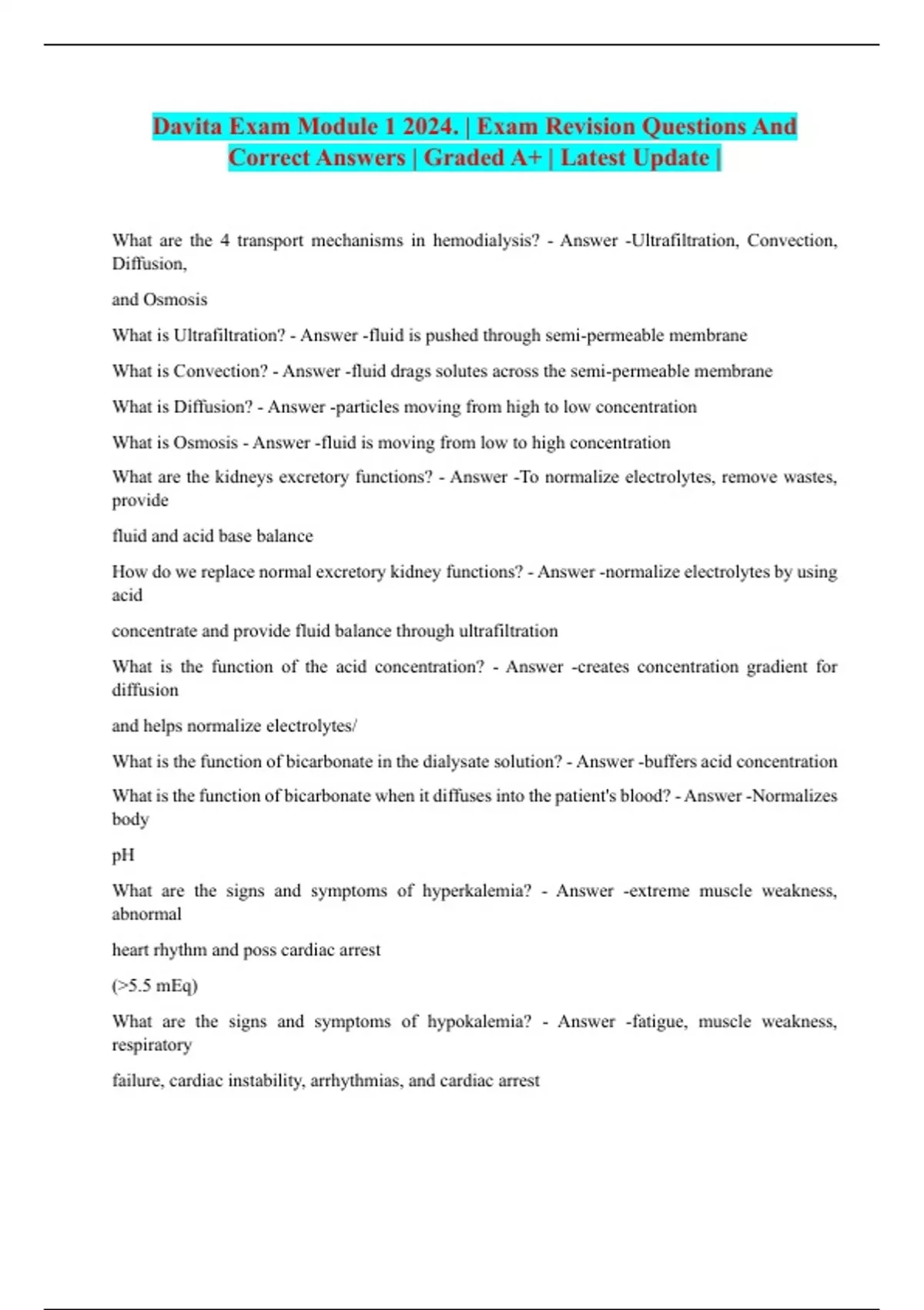 Davita Exam Module 1 2024. | Exam Revision Questions And Correct Answers | Graded A+ | Latest Update |