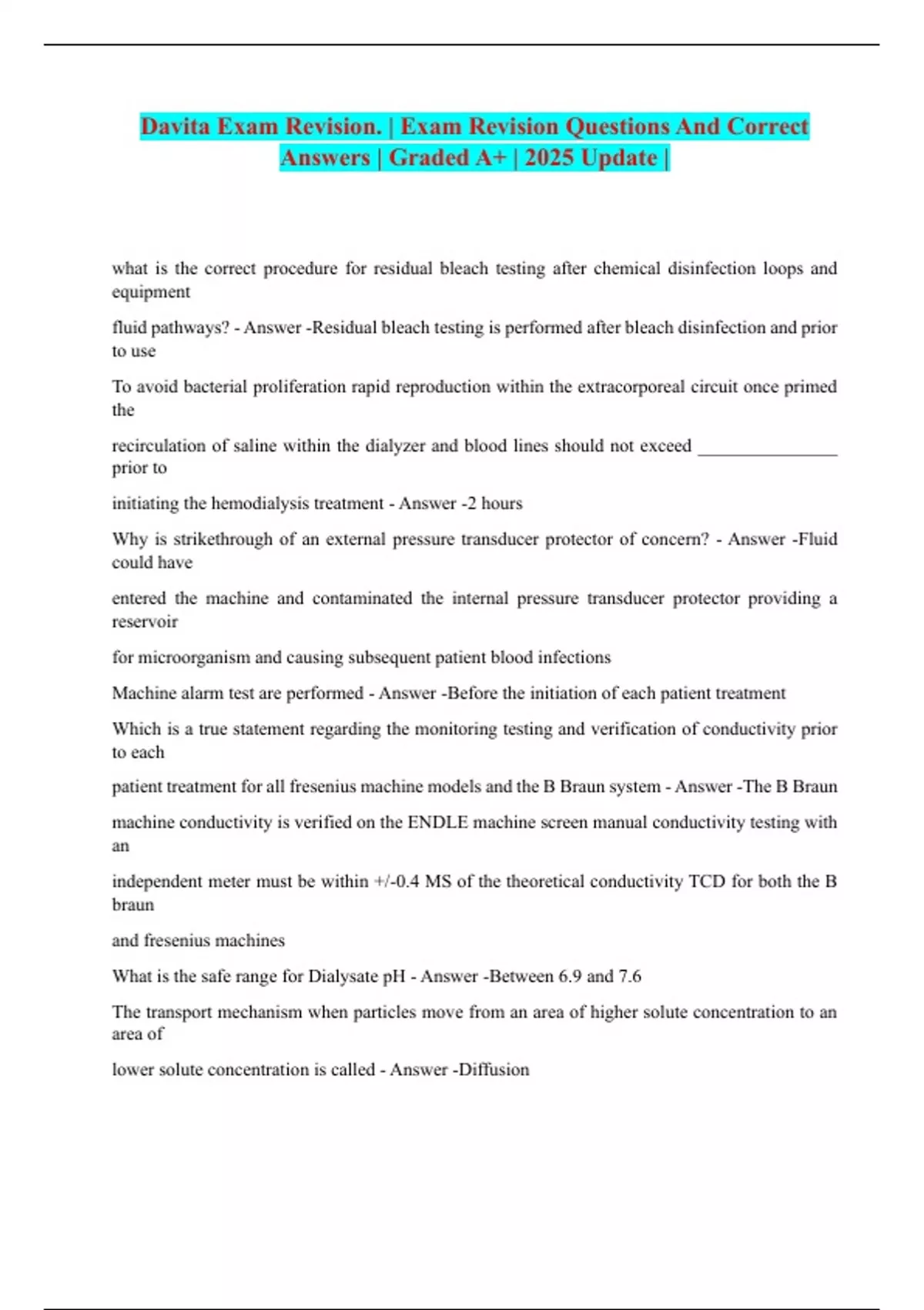 Davita Exam Revision. | Exam Revision Questions And Correct Answers | Graded A+ | 2025 Update |