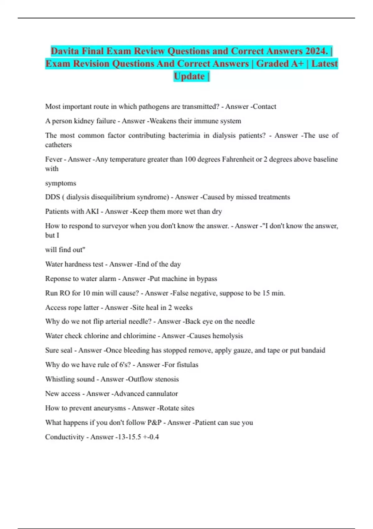 Davita Final Exam Review Questions and Correct Answers 2024. | Exam Revision Questions And Correct Answers | Graded A+ | Latest Update |