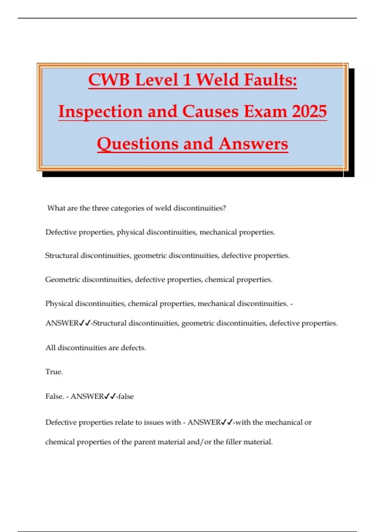 CWB Level 1 Weld Faults: Inspection and Causes Exam 2025 Questions and Answers